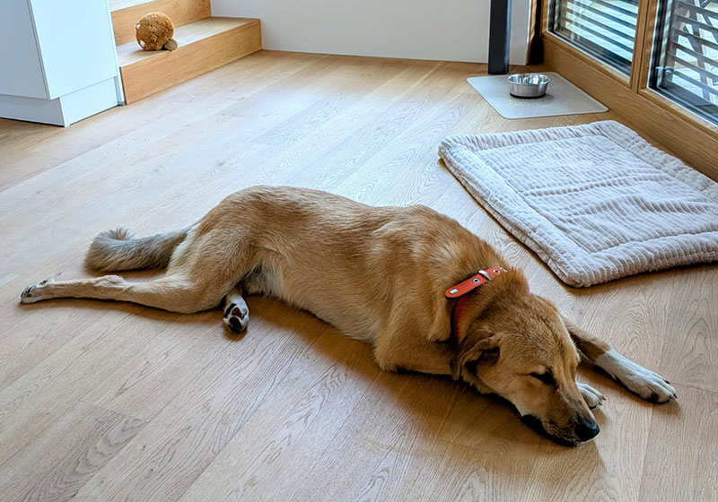 Unser Schlafzimmer befindet sich im Obergeschoss, und Emilio wollte die Treppe nach oben nicht gehen. Also habe ich die Isomatte ausgerollt und mit ihm in unserer Wohnküche übernachtet. Ich habe mich hingelegt, Emilio hat mir noch liebevoll gute Nacht gesagt und sich dann auch kommentarlos zur Ruhe gelegt. Wir haben bis 06:15 Uhr geschlafen.