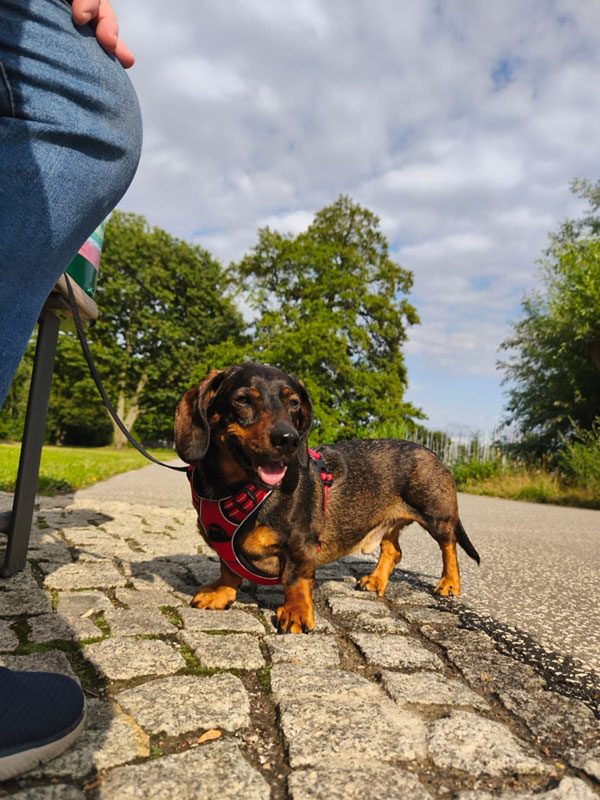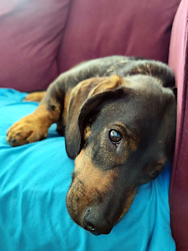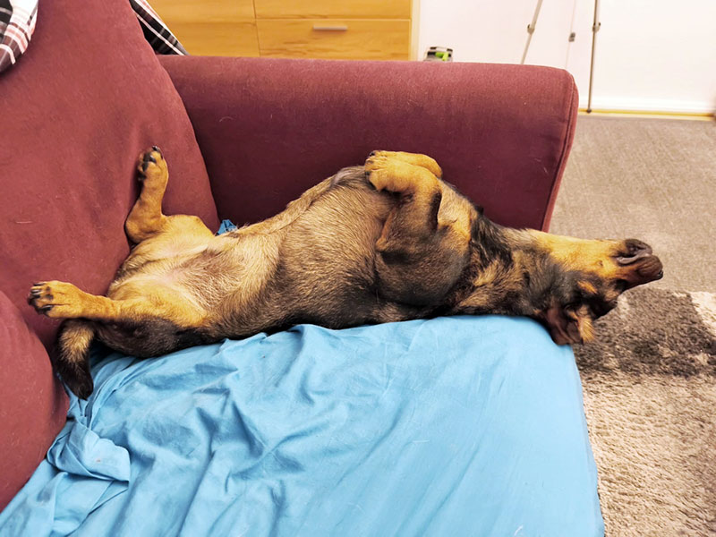 Zu Hause hat er sich gleich nach der Ankunft den Großteil des Sofas gesichert mir aber zum Glück eine kleine Ecke übrig gelassen damit ich die Gelegenheit bekomme mit ihm zu schmusen. Er ist ein wirklich ausgeglichener, in sich ruhender Hund, selbst der Baulärm auf der Straße scheint ihn nicht zu interessieren.