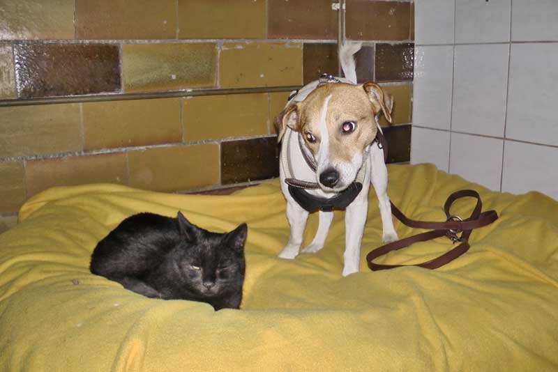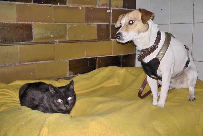 Nicht nur Bassos neues Frauchen war aus Nuthetal angereist, um nach einer neuen Katze Ausschau zu halten. In ihrer Begleitung befand sich auch einer der beiden selbstbewussten Jack-Russell-Terrier, die schon bei ihr wohnen. Die neue Katze musste also auf ihre Fähigkeiten als "Killer-Cat" mit Hypnoseblick, Selbstverteidigungs-Pfotenschlag und innerer Ruhe getestet werden. Basso nahm den Besuch gelassen.