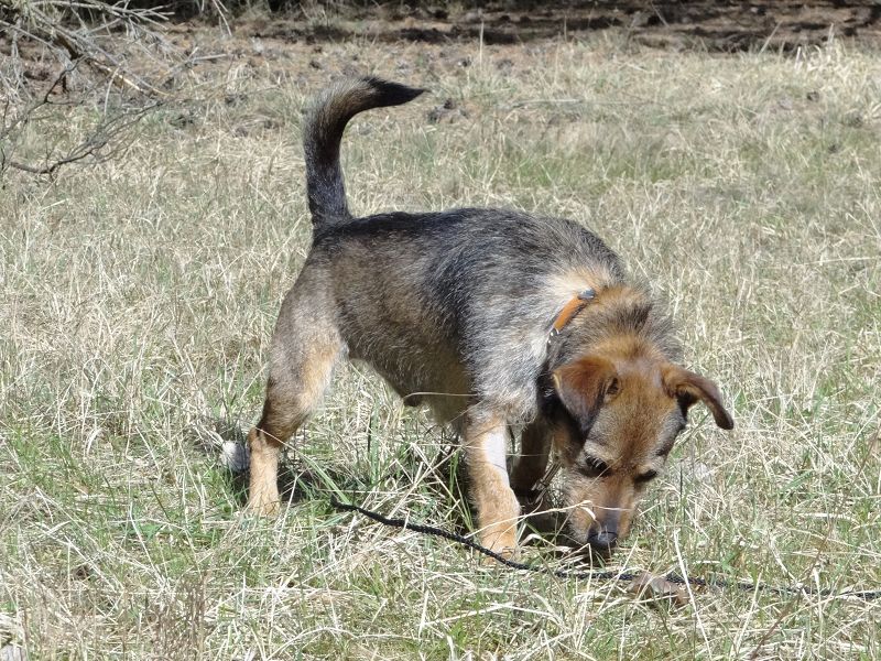 Er hat einen enormen Jagdtrieb. Seine Nase ist nur unten auf dem Boden, wo er nach Fährten sucht.