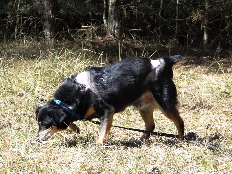 Dazu passen auch die anderen Verletzungen: Auf den Fotos sieht man kahle Hautstellen. Wir haben ein altes Foto gesehen, auf dem man großflächige frische Wunden erkennen kann: offensichtlich hatte jemand mit einem großen Messer versucht, sie im Hals- und Genickbereich bzw. auf dem Rücken zu zerschneiden. Die Wunden damals waren sehr großflächig, sind durch die tierärztliche Behandlung jetzt sehr gut verheilt und auch viel kleiner geworden. Aber die jetzt sichtbaren Stellen werden immer kahl bleiben. Dort muss die Haut auch besonders gepflegt werden.