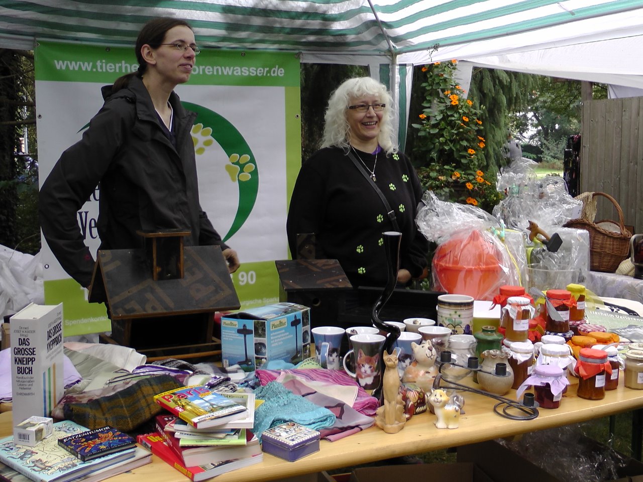 Ehrenamtlerin Annette (rechts im Bild) hatte selbstgemachte Marmelade mitgebracht. Auch Trödel, der bei uns abgegeben wurde, konnte gleich mit angeboten werden. Gemeinsam mit Tierpflegerin Anja und unserem Tierheimleiter betreute sie unseren Infostand.