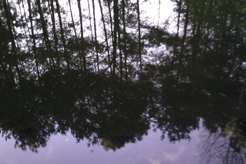 An unserem neu angelegten Teich haben sich inzwischen zig Kröten und Frösche eingefunden. Sie sind auf dem Foto, wo sich Kiefern im Teich spiegeln, kaum auszumachen. Wenn man am Teich sitzt, ist es völlig unmöglich, sie alle zu zählen. Und es schwimmen Hunderte von Larven im Wasser.