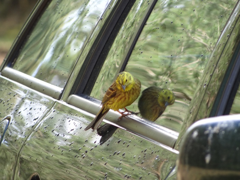 Die neugierige Goldammer auf den Fotos begutachtet gerade das Auto eines Tierpflegers nach einem Regenschauer. Oder sollen wir ihr unterstellen, dass sie sich eitel in der Scheibe spiegelt? Nein, eher vermutet sie dort wohl einen Partner.