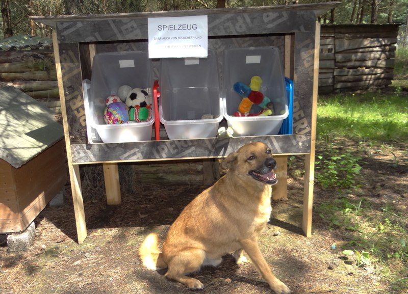 Einige Tierfreunde spendeten uns tolles Spielzeug. Unsere Mitarbeiter haben einen kleinen Unterstand gebaut, damit es ab sofort immer zur Verfügung steht, aber bei schlechtem Wetter trotzdem geschützt ist. Somit können nun auch Besucher im großen Auslauf jederzeit mit den Tieren spielen.