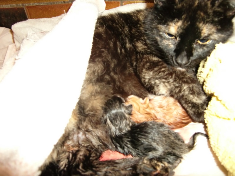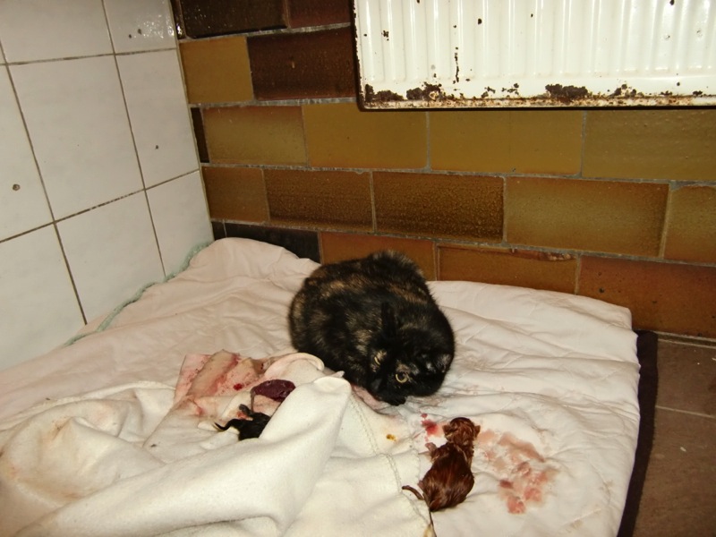 Doch die Kindsbewegungen ließen nach. Eine Tierpflegerin fuhr zum Ultraschall: 4 Babys waren zu erkennen. Unsere Tierärztin wollte noch etwas warten, ob die Katze es selbst schafft, bevor sie künstlich unterstützte. Dann kamen endlich zwei Kleine. Ein drittes wurde tot geboren. Vom vierten kein Lebenszeichen. Das bedeutete höchste Gefahr. Also verständigten wir unsere Tierärztin. Es war Samstagabend und unsere Tierärztin auf einem Familienausflug. Sie brach sofort ab, setzte sich ins Auto und kam 120 km angereist, um eine Not-OP durchzuführen. Während des Kaiserschnittes kam es bei der alten Katze zu einem Herzstillstand. Sie wurde schon blau. Doch unsere Tierärztin konnte sie und das vierte Baby retten.