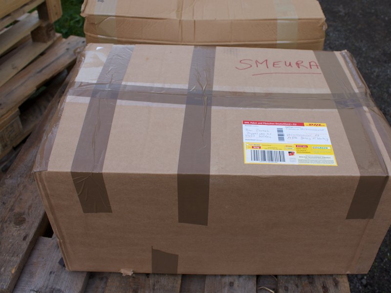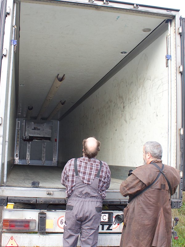Nach ein paar Stunden anstrengender Verladearbeiten taten den Helfern die Knochen wieder tüchtig weh, denn einige Paletten mussten aufgelöst und neu verstaut werden, weil der LKW-Fahrer die Achsen anders beladen haben wollte.