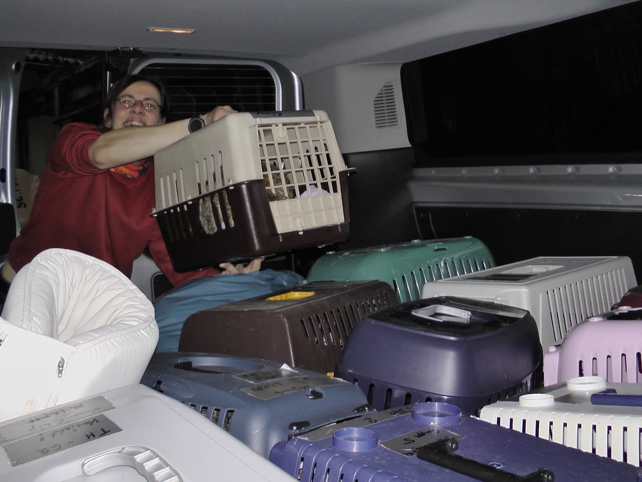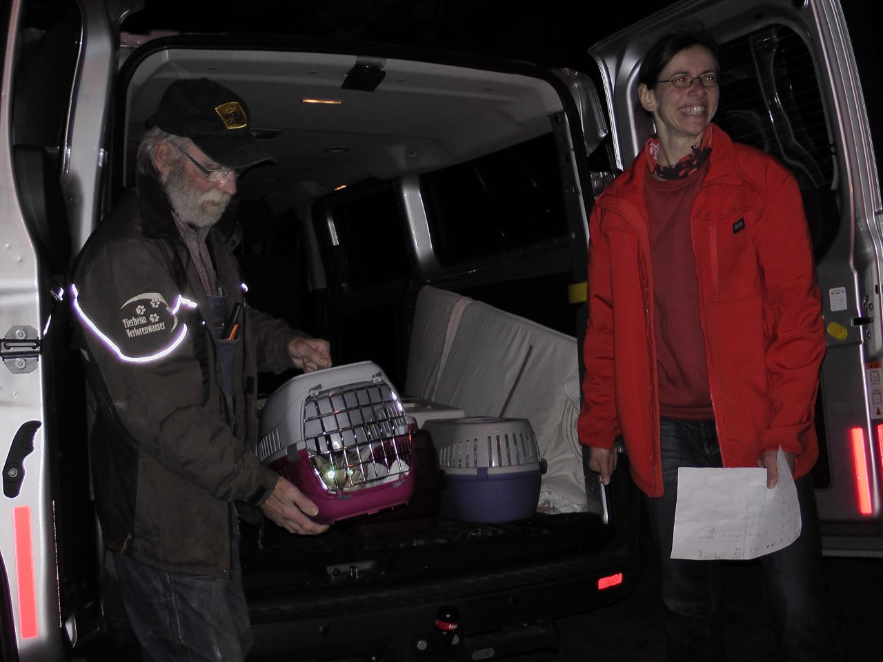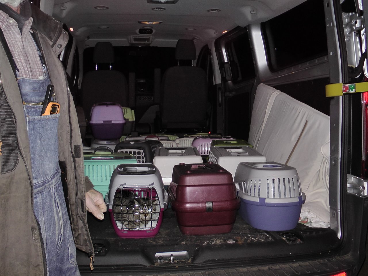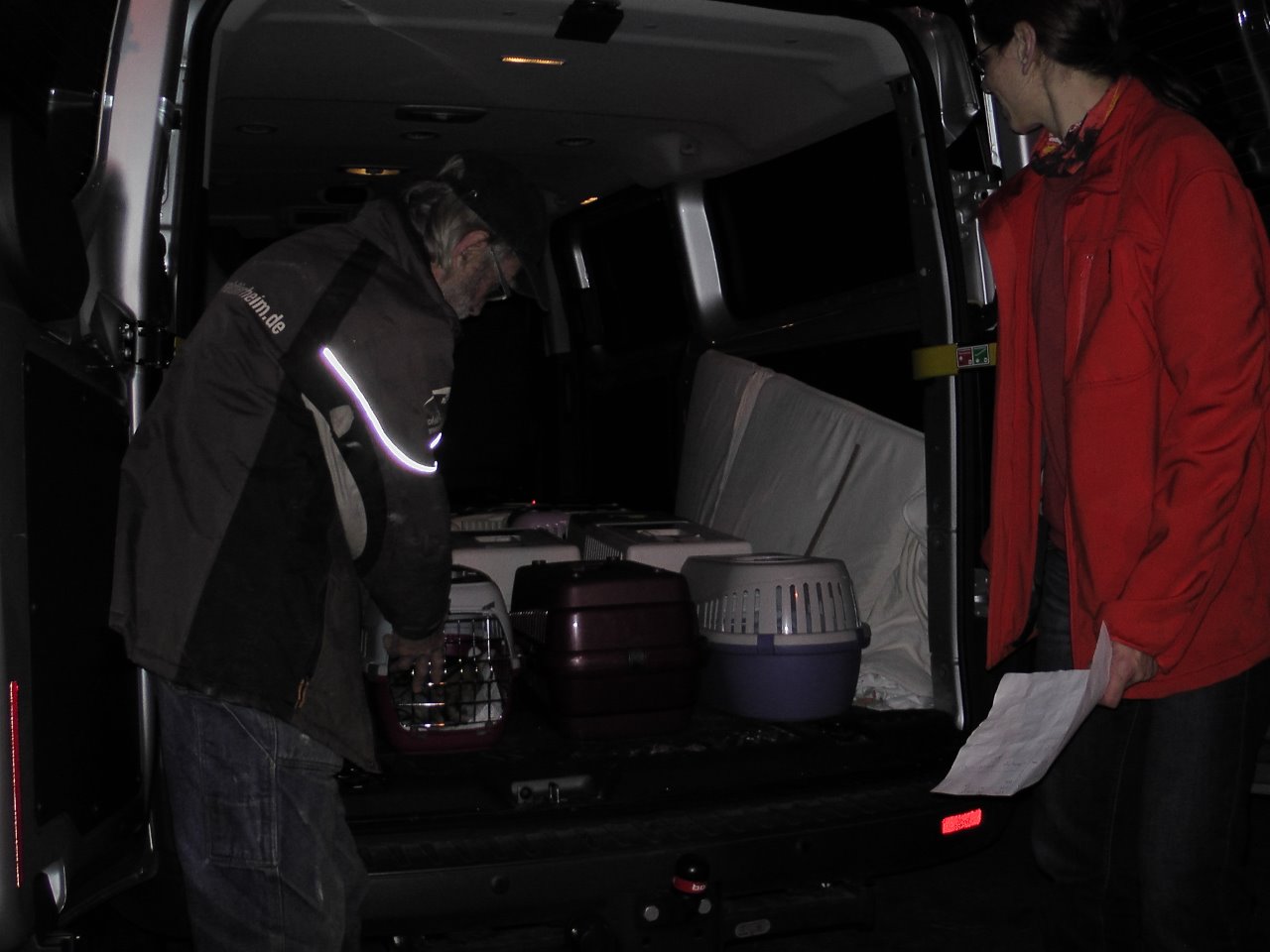 Obwohl: den Katzen hat es nicht so gefallen. Gabi, Anja, Simone und Siegfried verluden schon im Morgengrauen. Die Autofahrt ging zwar, da alle Boxen gut ausgepolstert und verzurrt waren, aber das Frühstück war wegen der bevorstehenden OP ausgefallen. Das können unsere Minitiger gar nicht leiden, denn sonst sind die Näpfe immer gut gefüllt. Aber wat mutt, dat mutt!