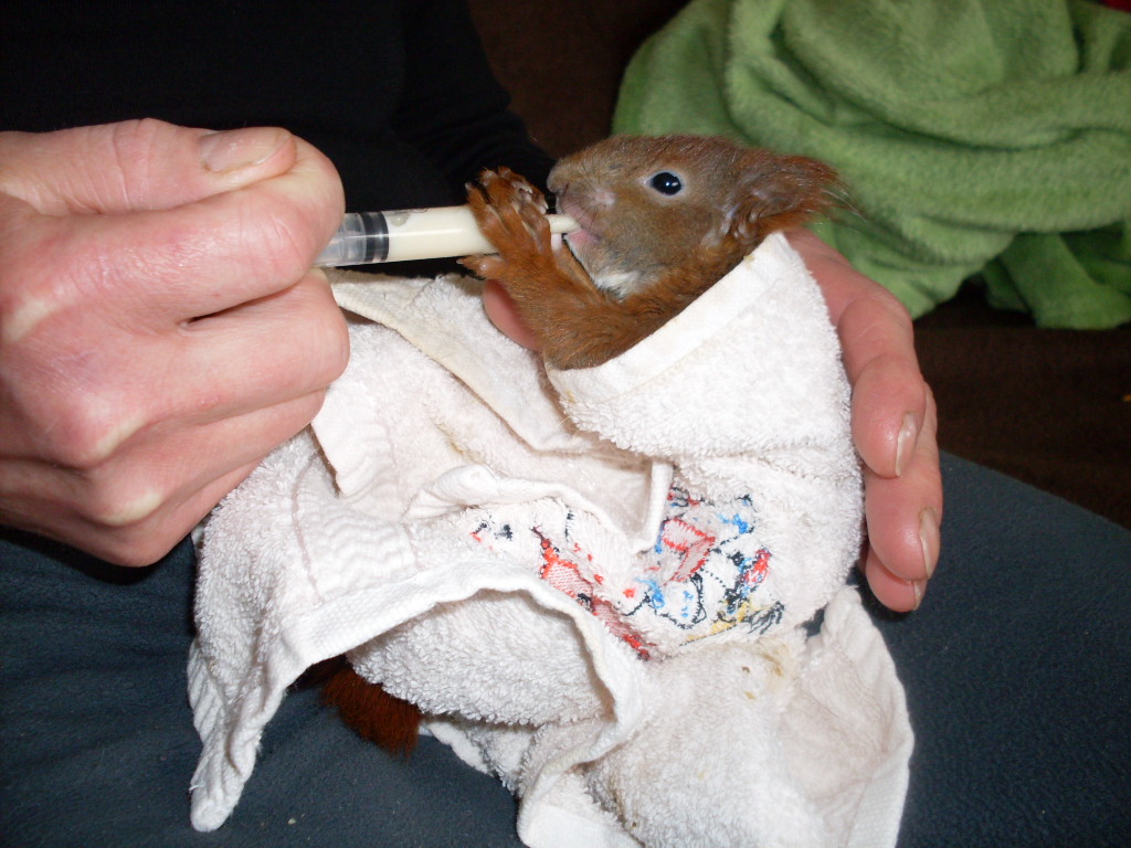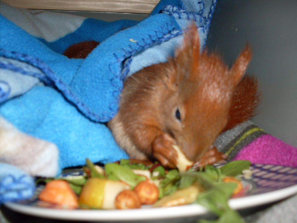 SDC10435Die beiden aus dem Nest gefallenen Eichhörnchen taten sich die ersten Tage sehr schwer. Sie tranken kaum und waren auch nicht an Brei oder feste Nahrung heranzuführen. Egal, was wir versuchten, sie nahmen es nur schwer an. Mit Mühe und Not und tierärztlicher Hilfe konnten wir gerade so das Gewicht aufrechterhalten.