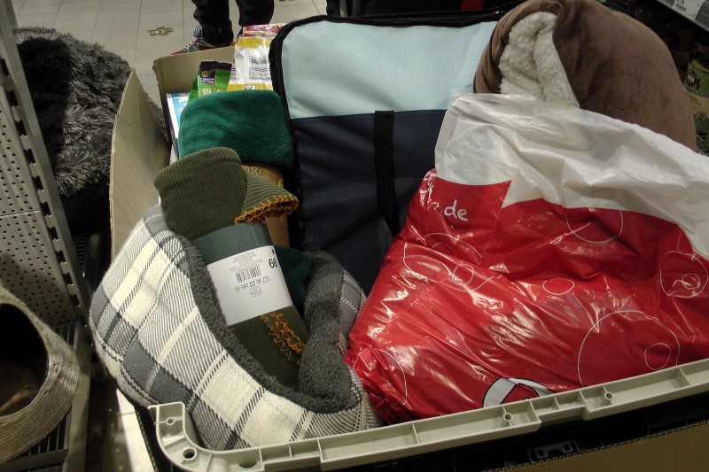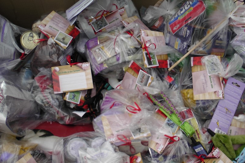 Wie man sieht, hatten die netten Fressnapf-Mitarbeiter sie auch noch reichlich gefüllt mit den gespendeten Leinen und Geschirren, mit Spielzeugen und Leckerlis.