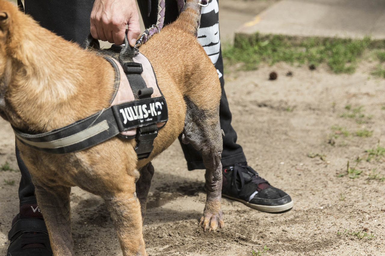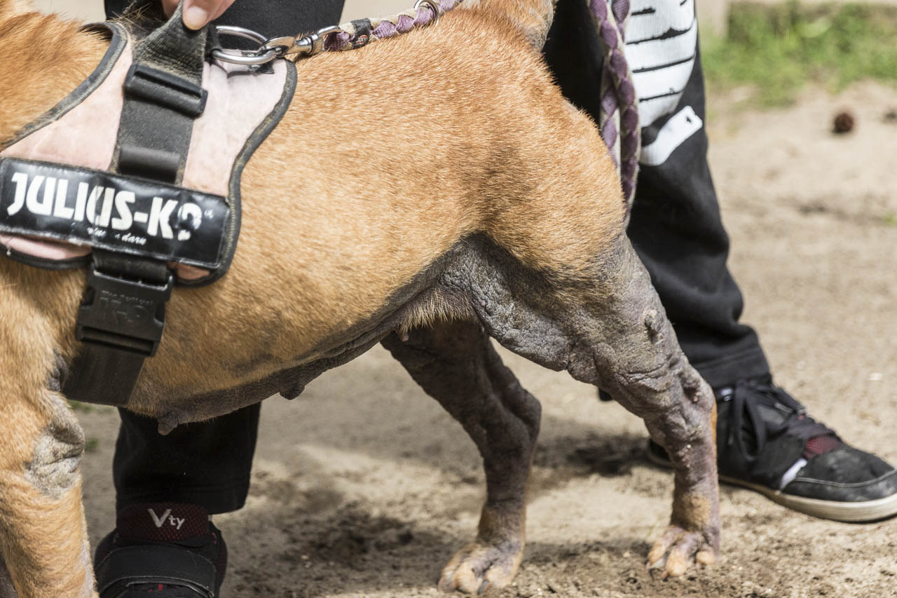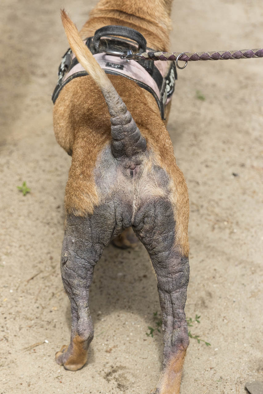 Der Vorbesitzer teilte uns mit, dass ihre Hautprobleme stressbedingt sind aufgrund eines Umzugs vor eineinhalb Jahren. Einen Tierarzt hat die Hündin aber schon ewig nicht mehr gesehen.