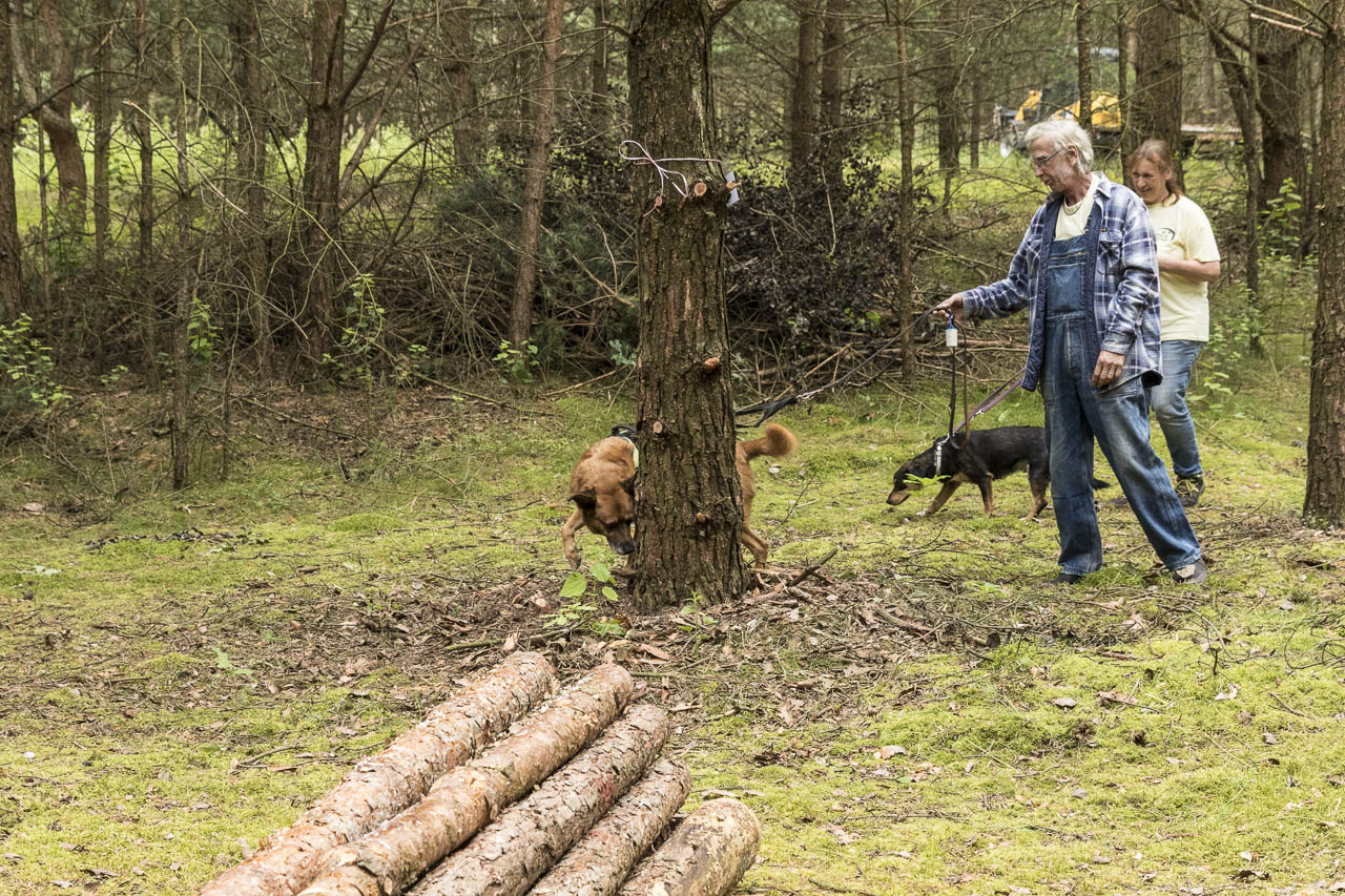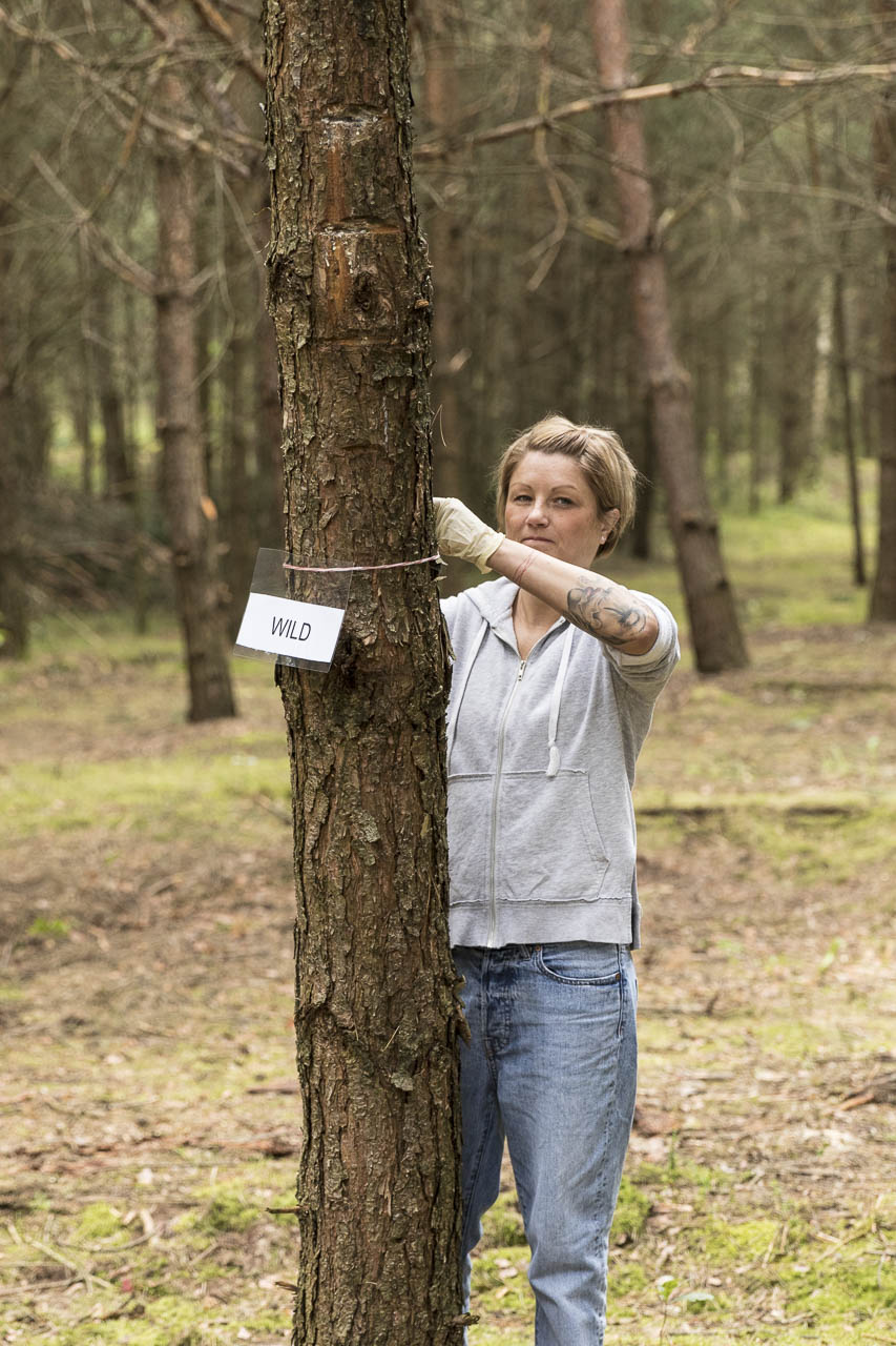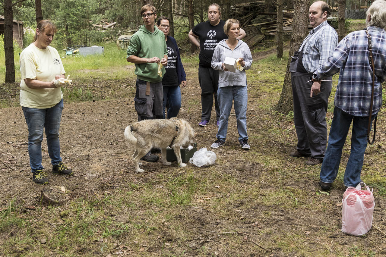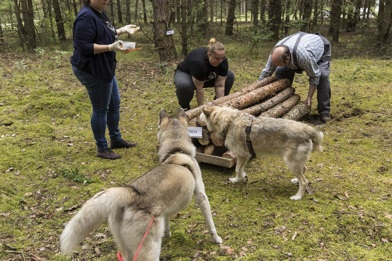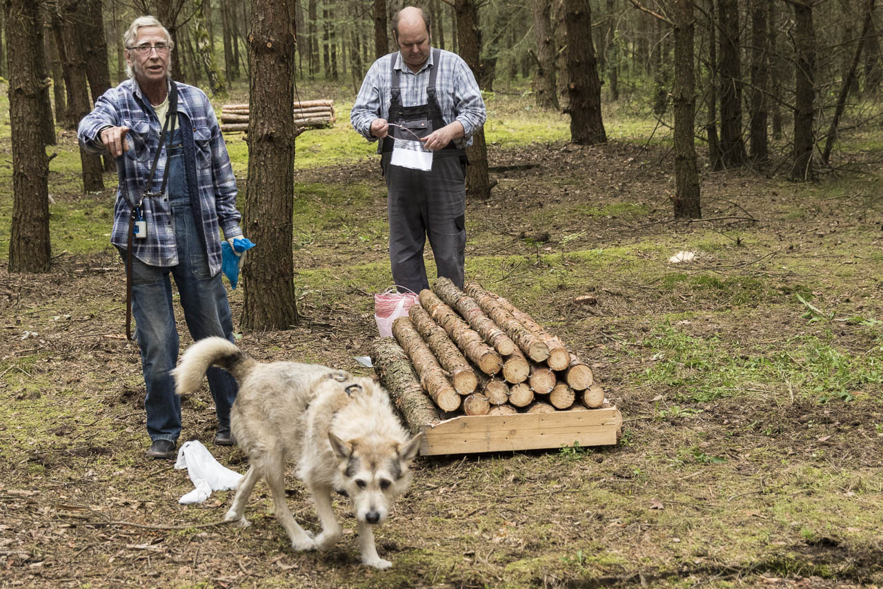 Zuvor hatten wir einige Bäume mit herrlich stinkenden Aromen "parfümiert": Kot von Wild, Schaf und Schwein, Katzenfutter, Schafwolle, Pansen und alter Fisch. Dieser kam besonders gut an. Die Bäume haben wir beschriftet, damit unsere Mitarbeiter wissen, wo neu aromatisiert werden muss, denn die Gerüche werden sich ja verflüchtigen.