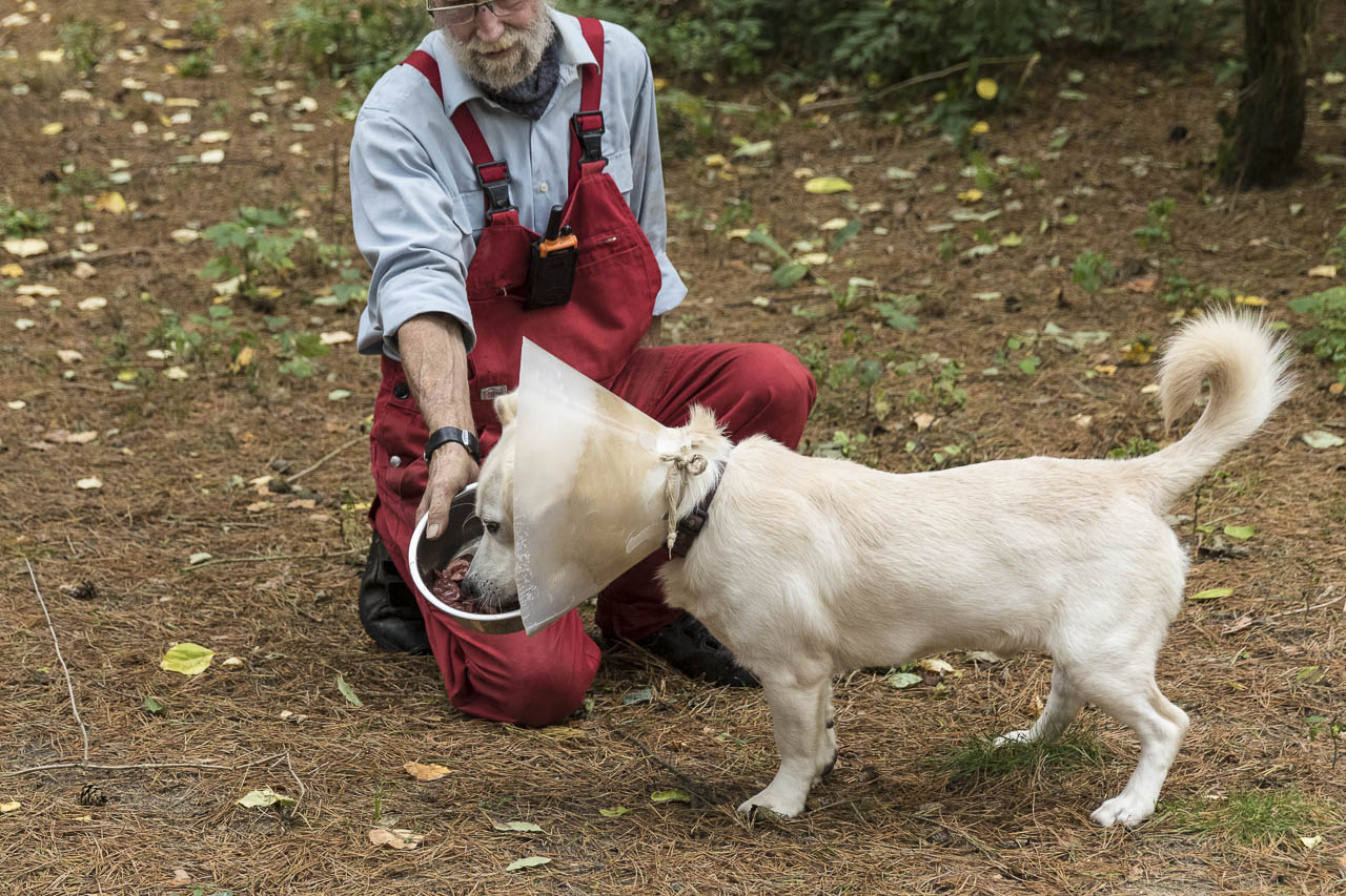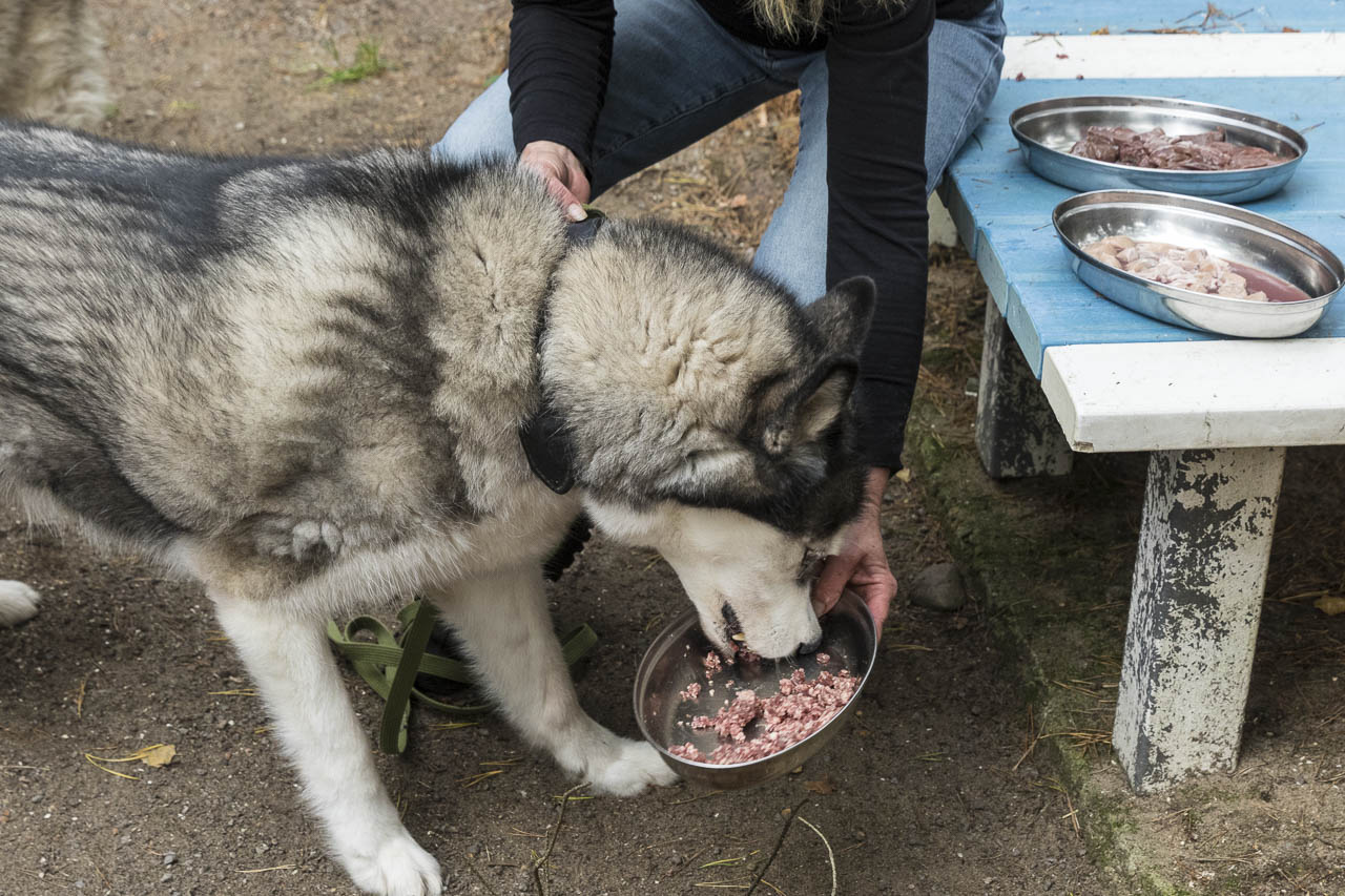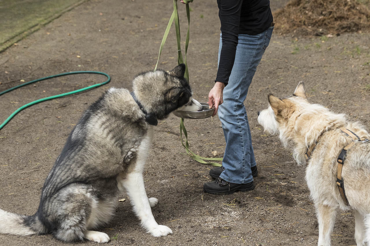 Natürlich gehörte Bommel zu den Begünstigten. Er durfte sich seine Sorte aussuchen, musste dann aber etwas abgeben und konnte zum Schluss noch einmal die Reste leeren. Zu den anderen Glücklichen, die auch schleckern durften, gehörte u.a. unser alter Husky-Rüde Yupek, der schon ewig bei uns sitzt, ebenso Leo, der medizinisch behandelt werden muss und sich überhaupt nicht wohl fühlt mit dem ollen Kragen, und Ribo, der kleine schwarze Hund - einer der ängstlichen MeckPom-Hunde, die wie noch ein paar andere auch etwas abbekamen.