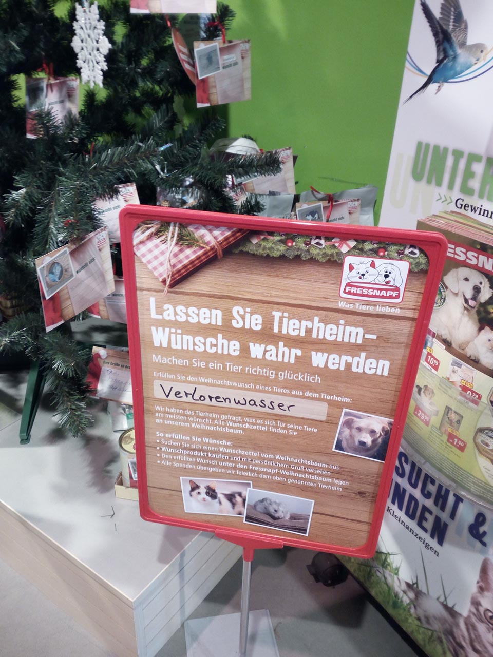 Sie wird von den Tierfreunden so gut angenommen, dass unser Tierheimleiter bereits zum Fressnapf in der Goerzallee kommen durfte, um die ersten Spenden abzuholen, denn der Sammelcontainer war bereits übervoll und kein Platz mehr unter dem Weihnachtsbaum.