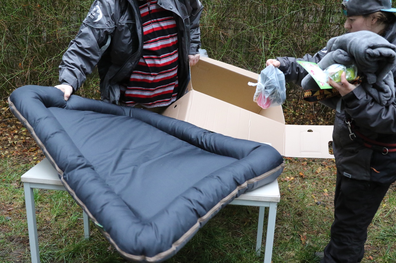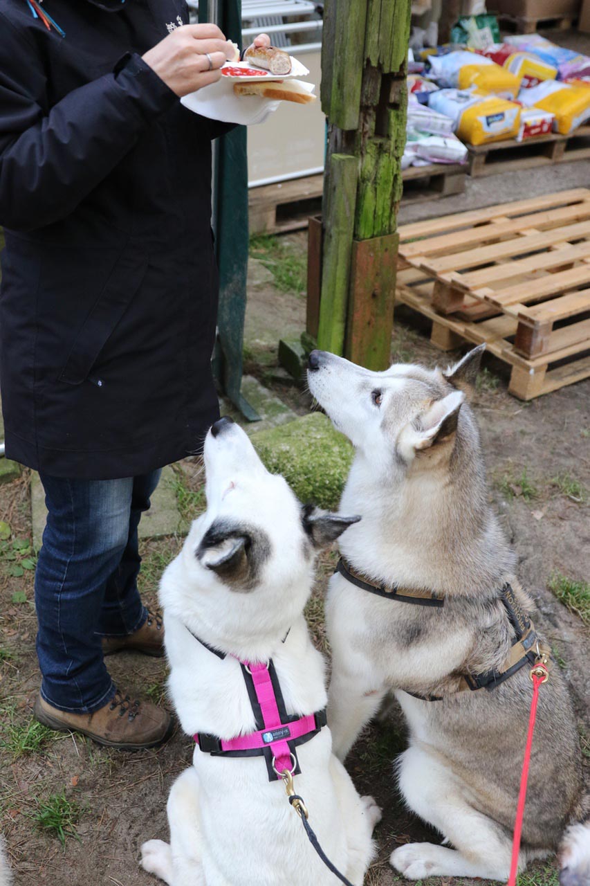 Einige Post-Pakete waren noch nicht ausgepackt, darunter eine große Lieferung für Yupek. Er bekam von Tierfreundin Steffi eine eigene schöne neue Ausstattung. Das Bett wurde von Yupek gleich nach dem Auspacken in Augenschein genommen und mit einem Husky-Lied begrüßt.