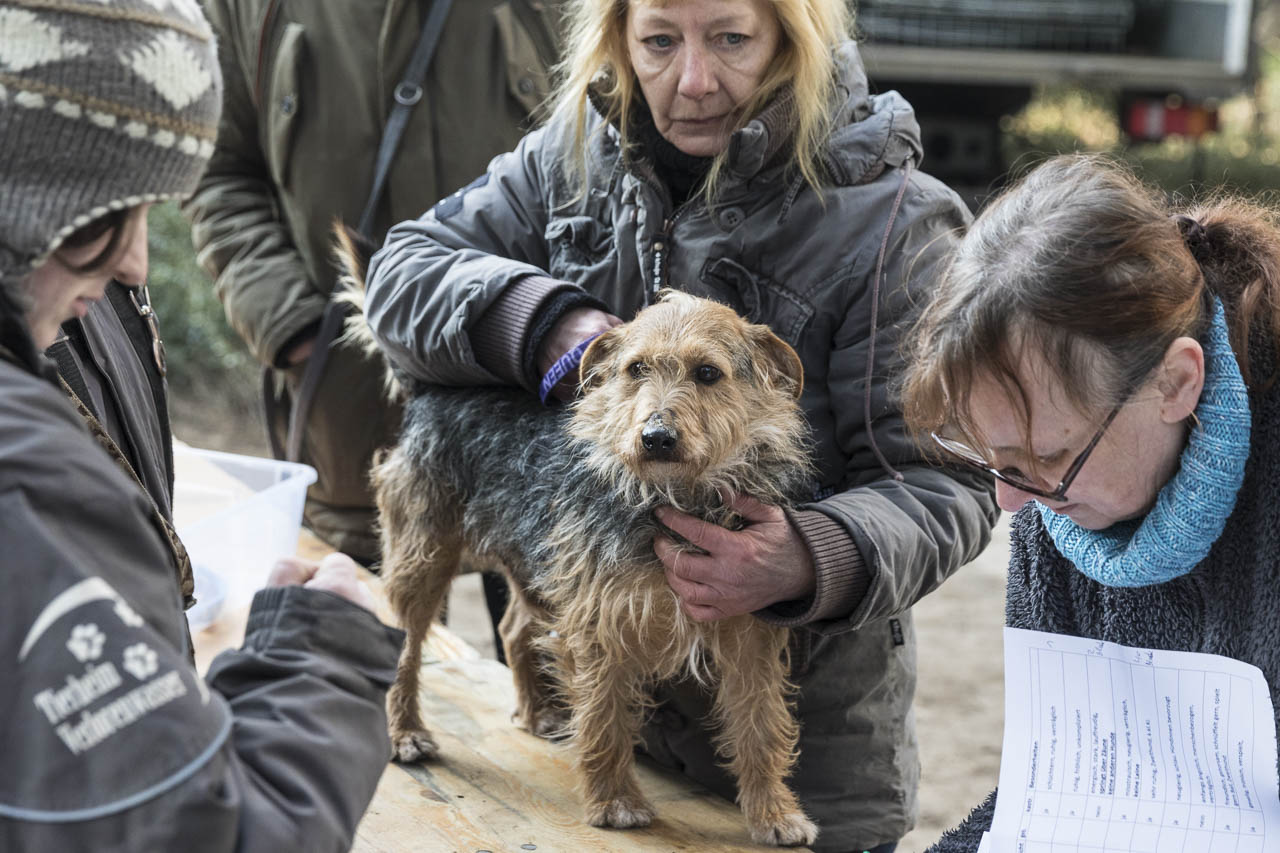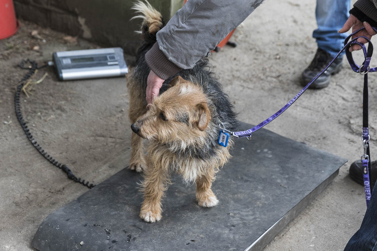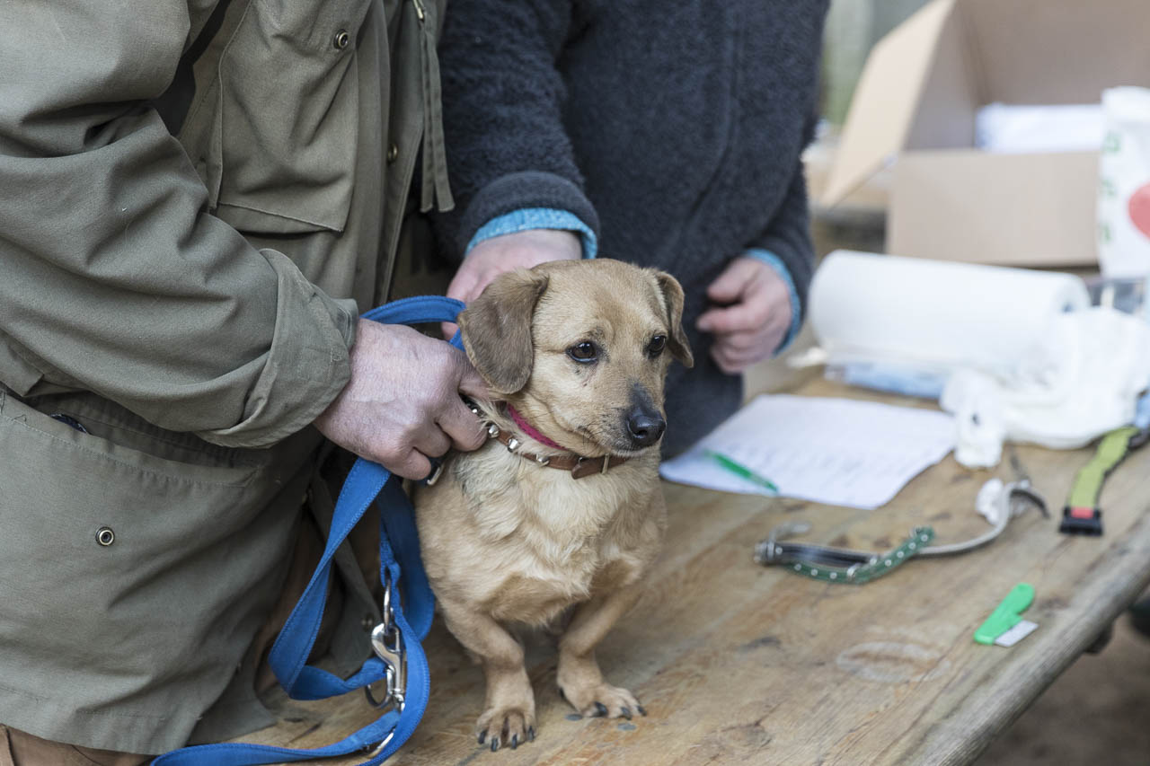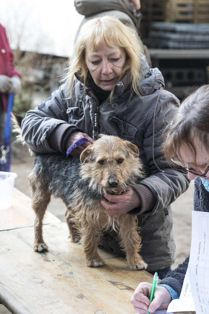 Dann ging es auf die Waage. Ein passendes Halsband musste herausgesucht werden. Der Chip wurde ausgelesen und alle Papiere verglichen.