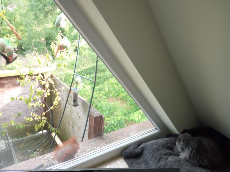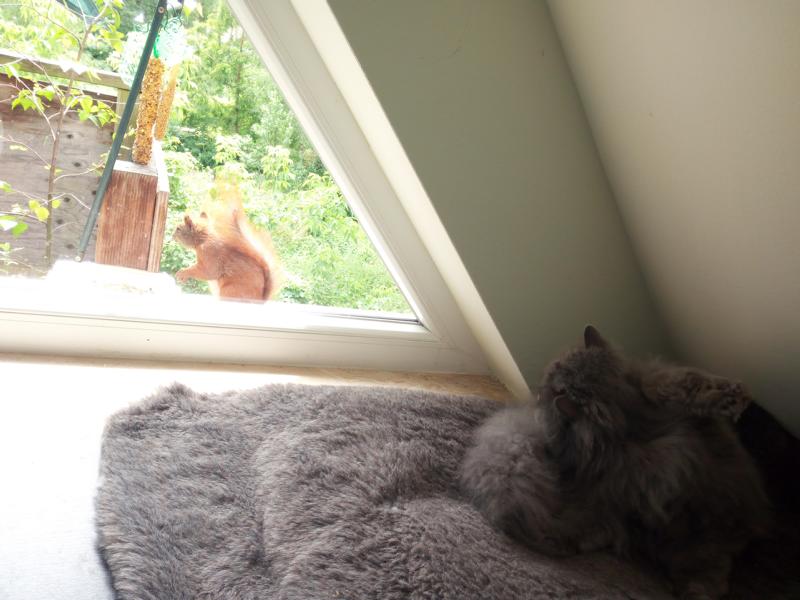 Mit einer der Kätzinnen hat sich die Eichkatzenmama sogar derart angefreundet, dass sie immer erst kommt und durch die Scheibe ins Zimmer schaut, ob ihre Lieblingskätzin in der Nähe ist. Mitunter geben sich die beiden sogar Küsschen durch die Scheiben. Dabei berühren beide tatsächlich mit ihrem Mäulchen gleichzeitg die Scheibe. Die Kätzin legt sich auch auf die Seite und beide versuchen, sich mit ihren Pfötchen zu tätscheln.