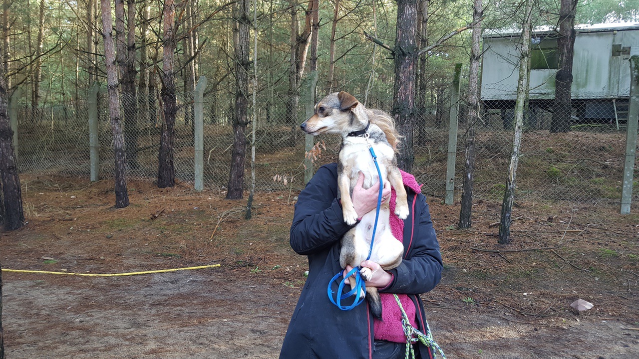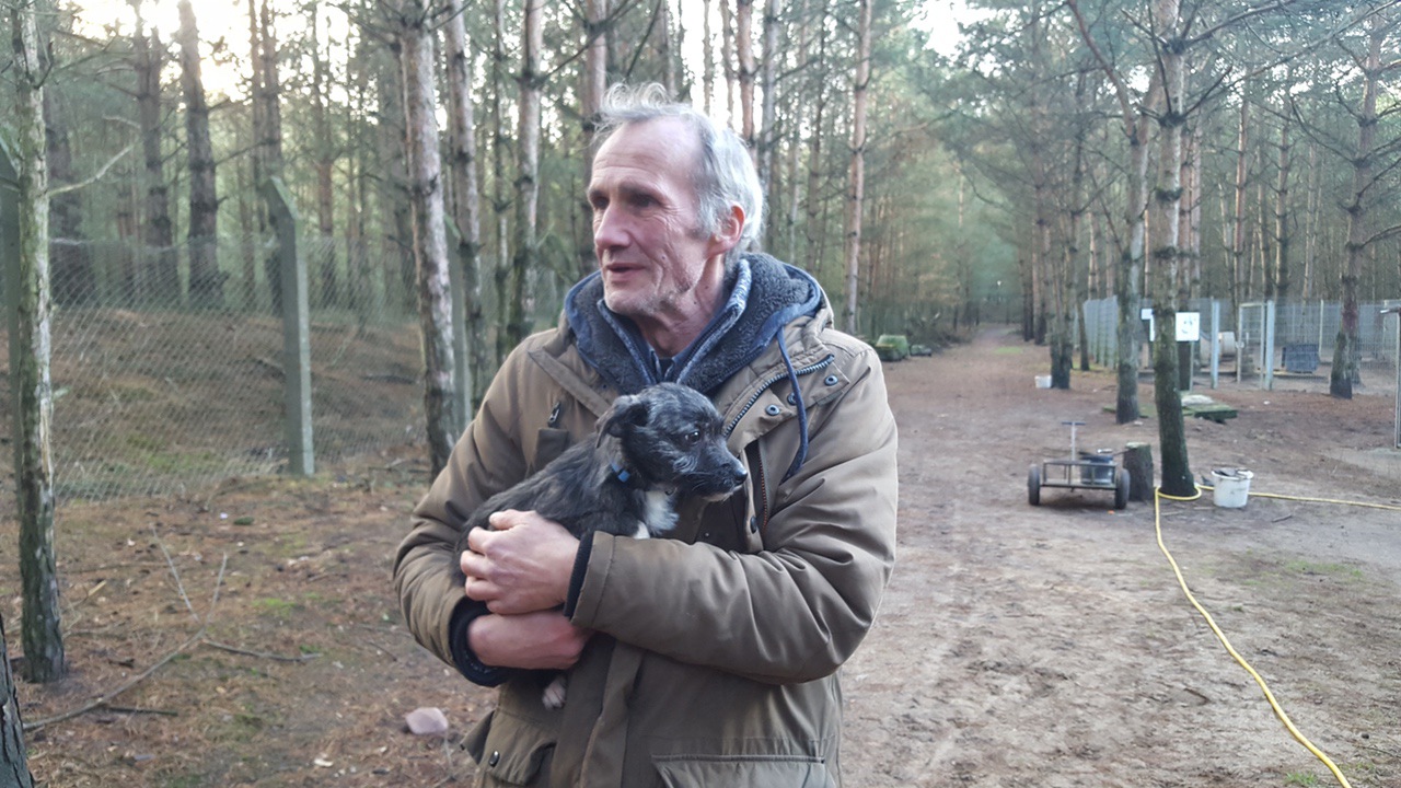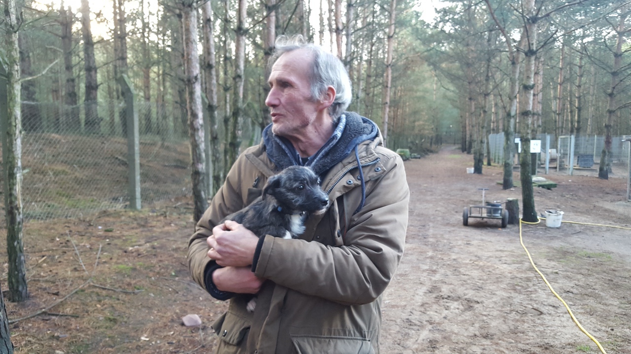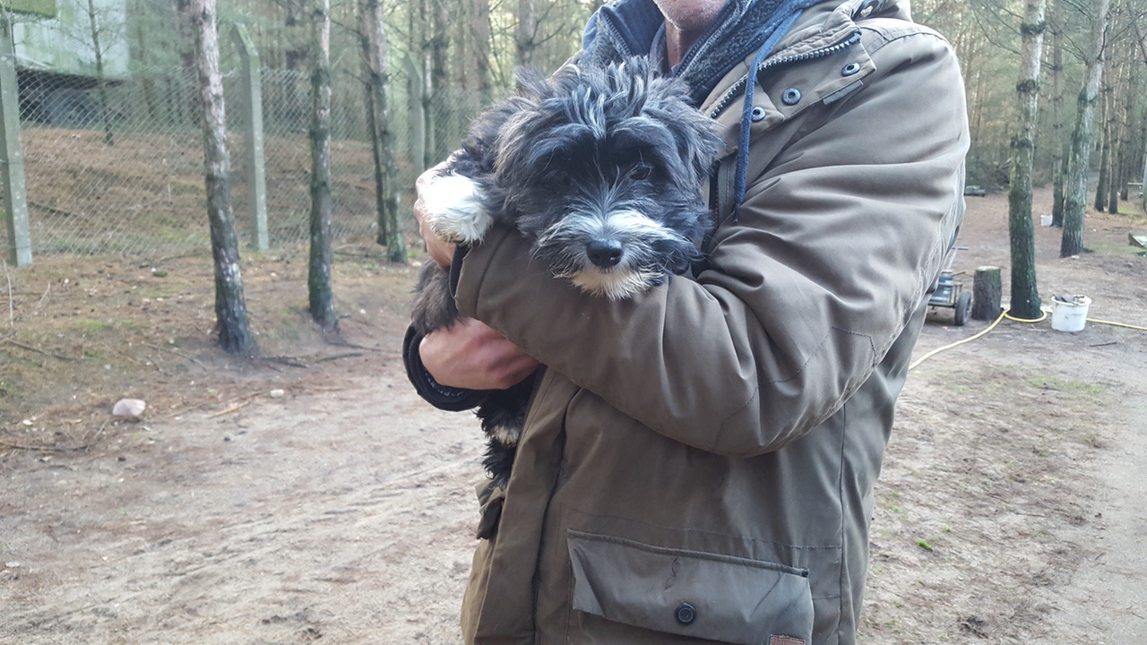 Bei unserem Ehrenamtler Clemens auf dem Arm sitzt eine helle beigefarbene Hündin. Der schwarze Welpe mit der weißen Brust ist ein Rüde. Die Strubbeline mit hellen Haaren um die Nase herum ist ein Welpenmädchen.