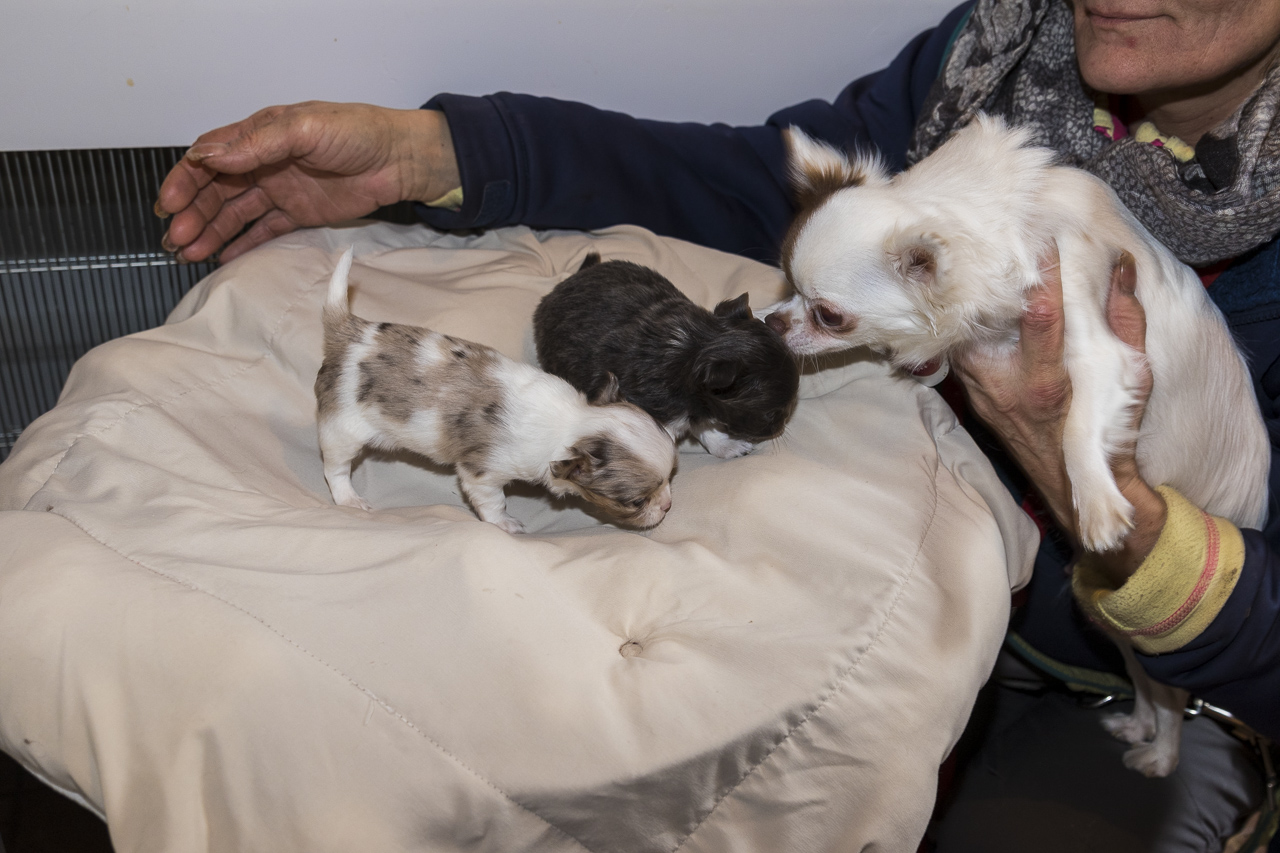 Chihuahua-Mama Mira kümmert sich ebenso engagiert wie unsere Tierpfleger, so dass die Minis hoffentlich gesund in die Zukunft kommen werden .