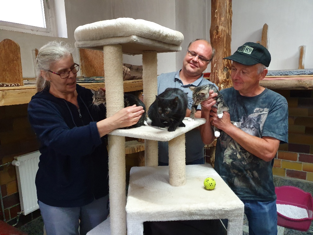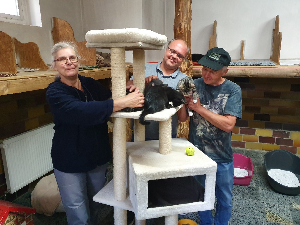 Tierheimleiter Maciej (mit Basecap), Dolmetscher Michael und unsere Tierpflegerin Ilona weihten dann auch gleich ein Katzen-Häuschen ein, dass wir just von einem Fressnapf in Berlin gespendet bekommen hatten.