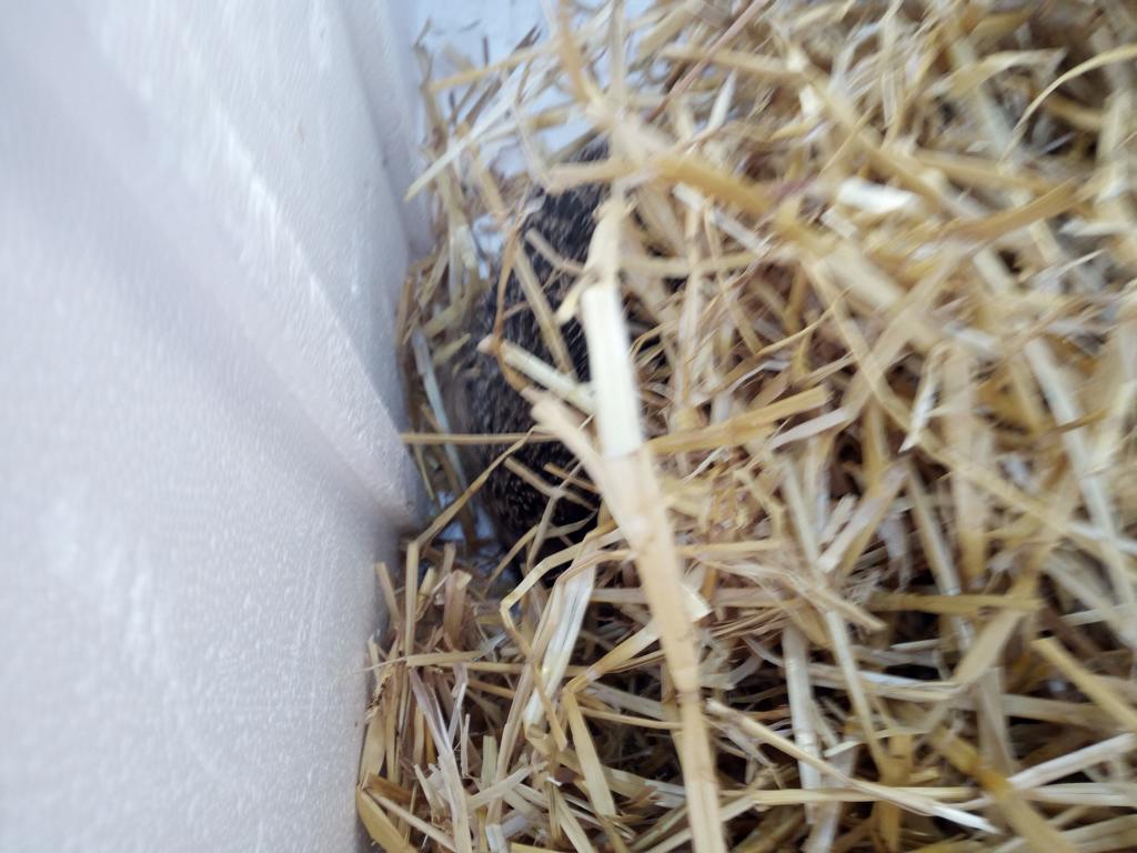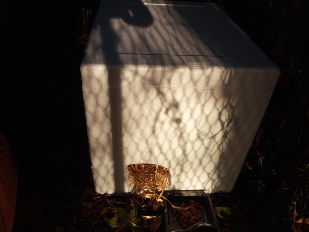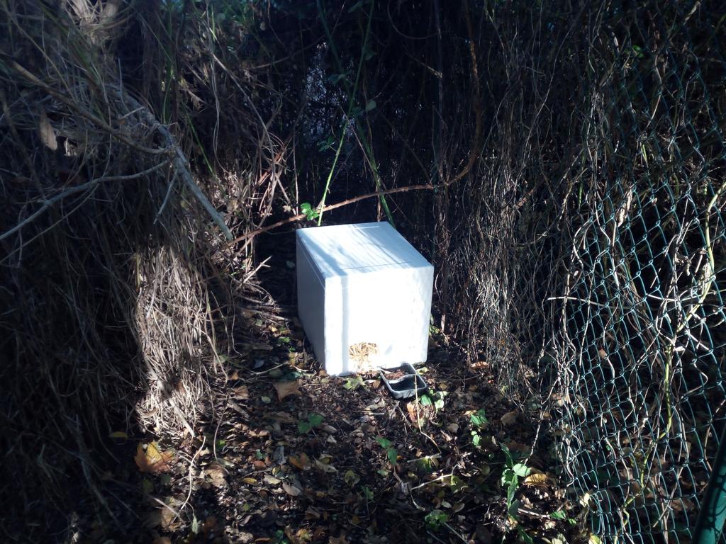 Zusätzlich haben wir ihnen Styropor-Boxen hingestellt, die mit Stroh befüllt und mit Laub abgedeckt werden.