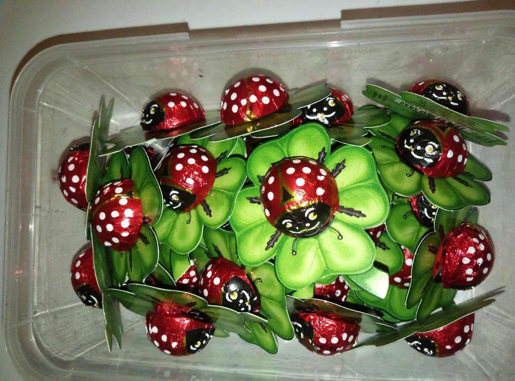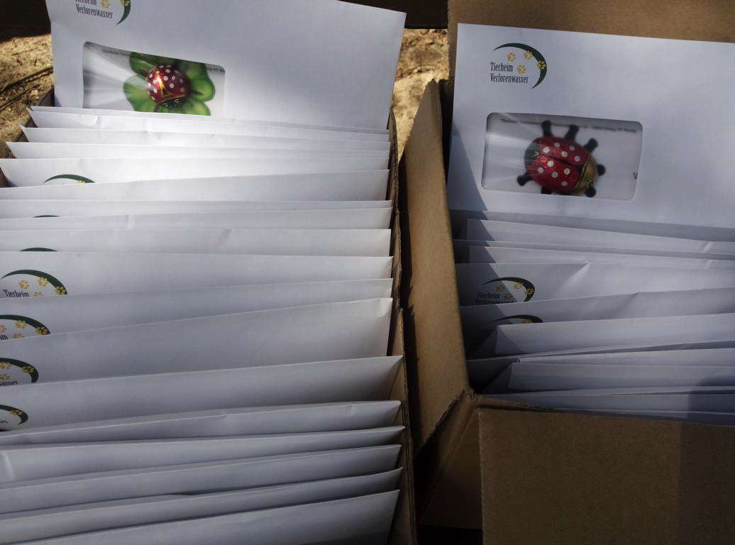 Wir legten jedem Brief einen kleinen Schoko-Glückskäfer bei. Es waren noch welche übrig vom Jahresbeginn, als wir für jeden Mitarbeiter und einige Ehrenamtler Tütchen gebastelt hatten mit vielen Glücksbringern für 2020 darin.