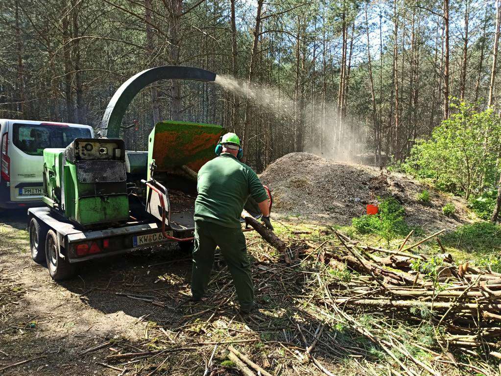 Die Holzschnitzel werden wir als Humusdecke ausbreiten. Damit wird auch die Feuchtigkeit besser im Boden gehalten.