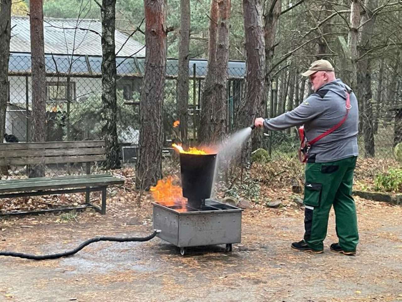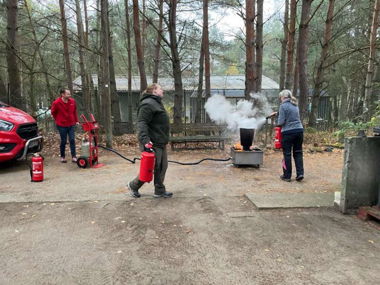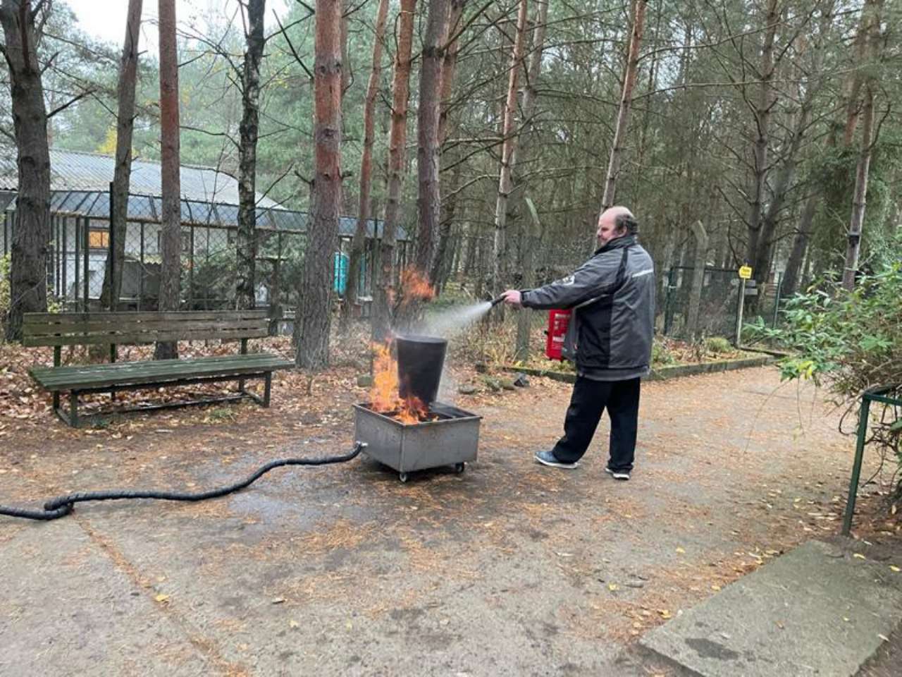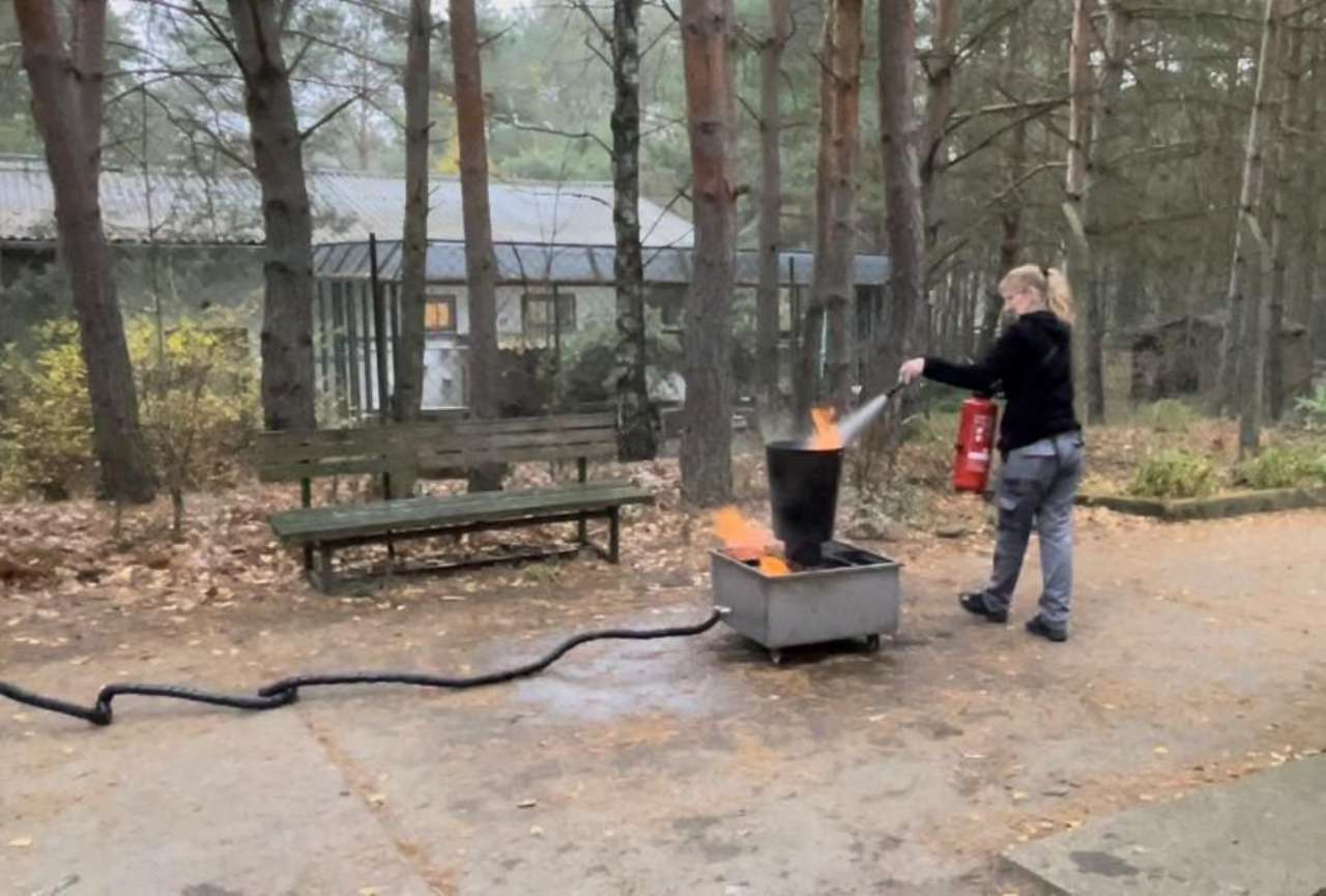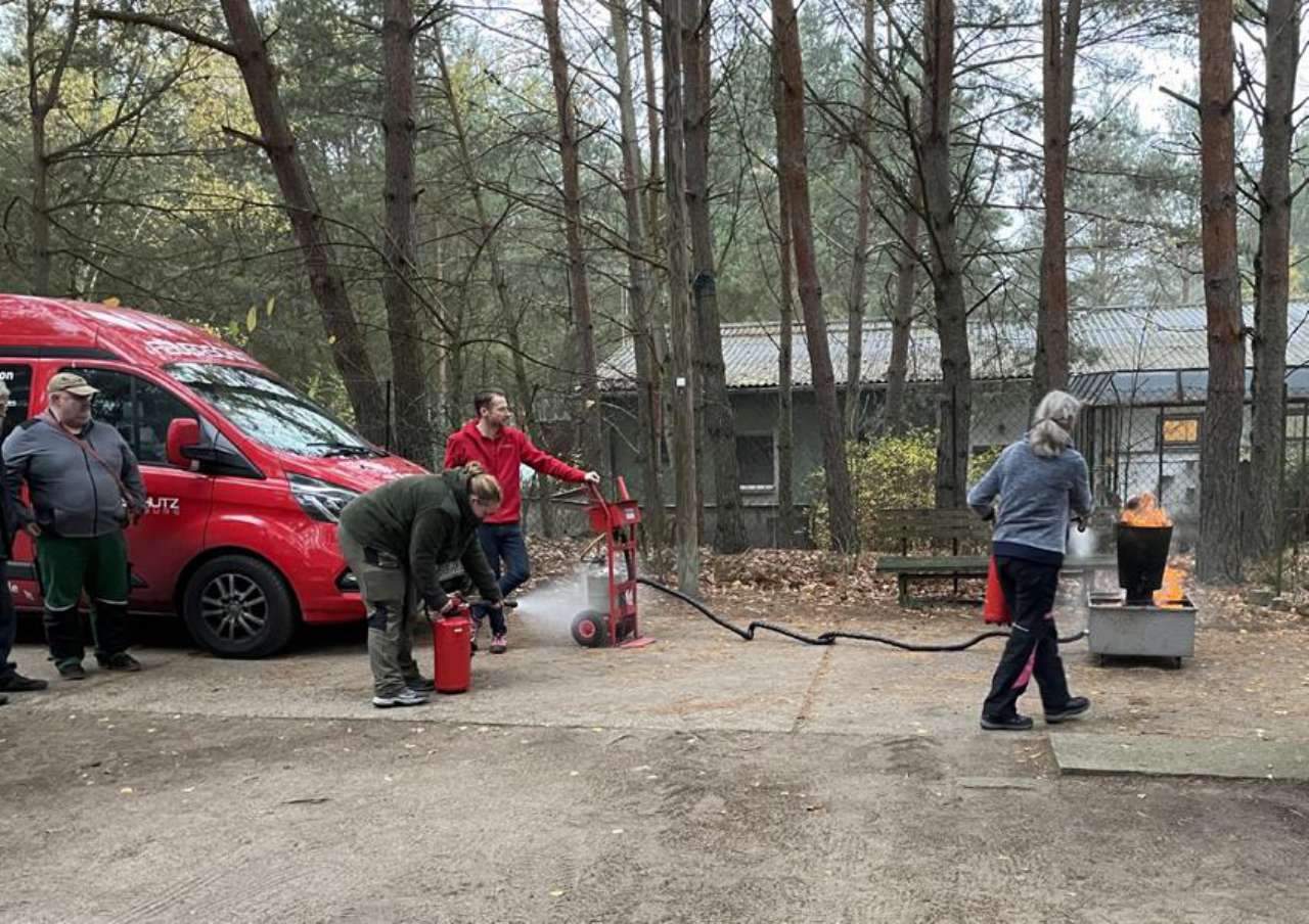Herr Hermann von einer spezialisierten Schulungsfirma aus Brandenburg/Havel kam zu uns ins Tierheim. Zunächst gab es eine ausführliche theoretische Unterweisung zu Brandschutzmaßnahmen generell - und dann durfte jeder selbst probieren, ein kleines Feuer zu löschen.