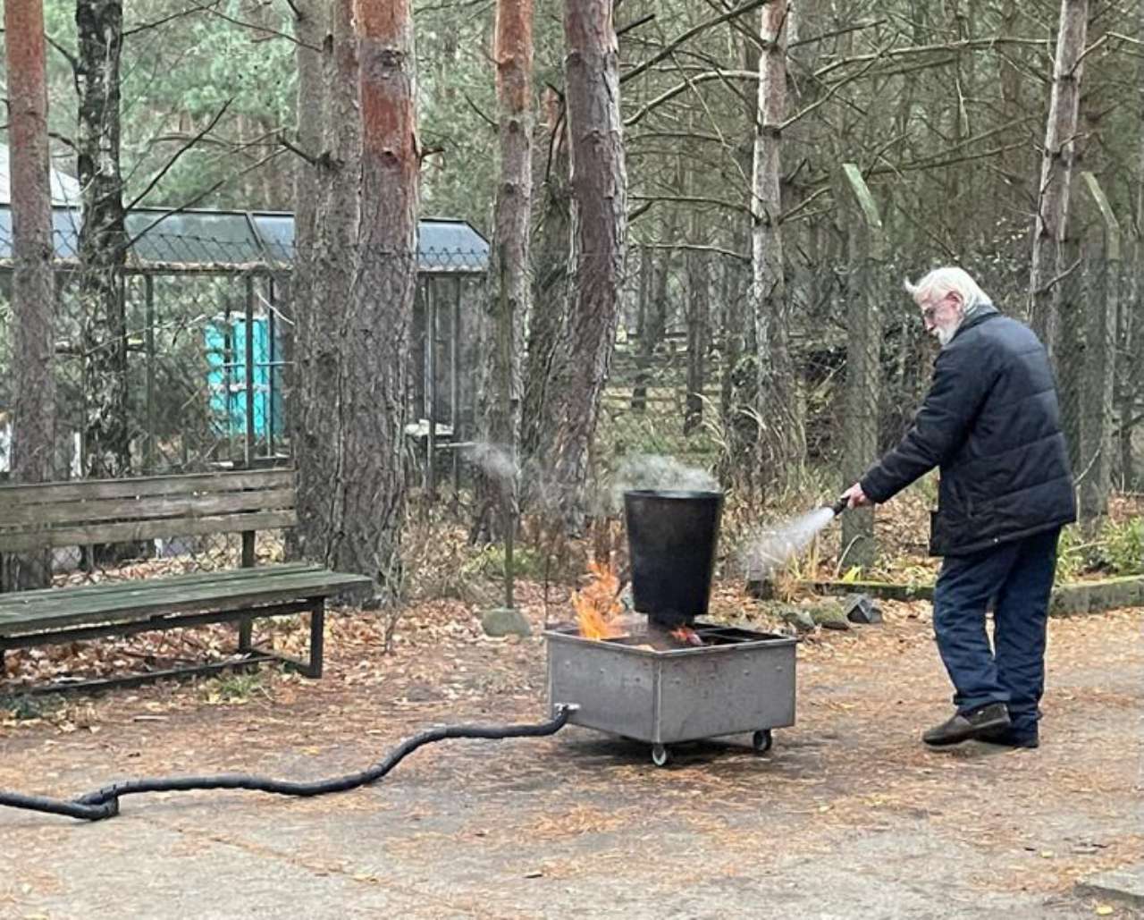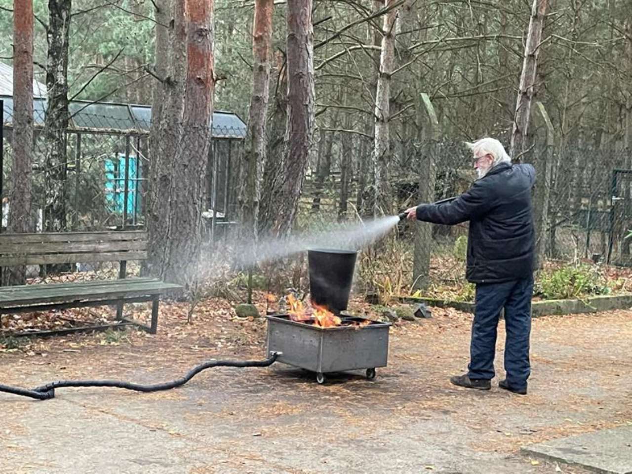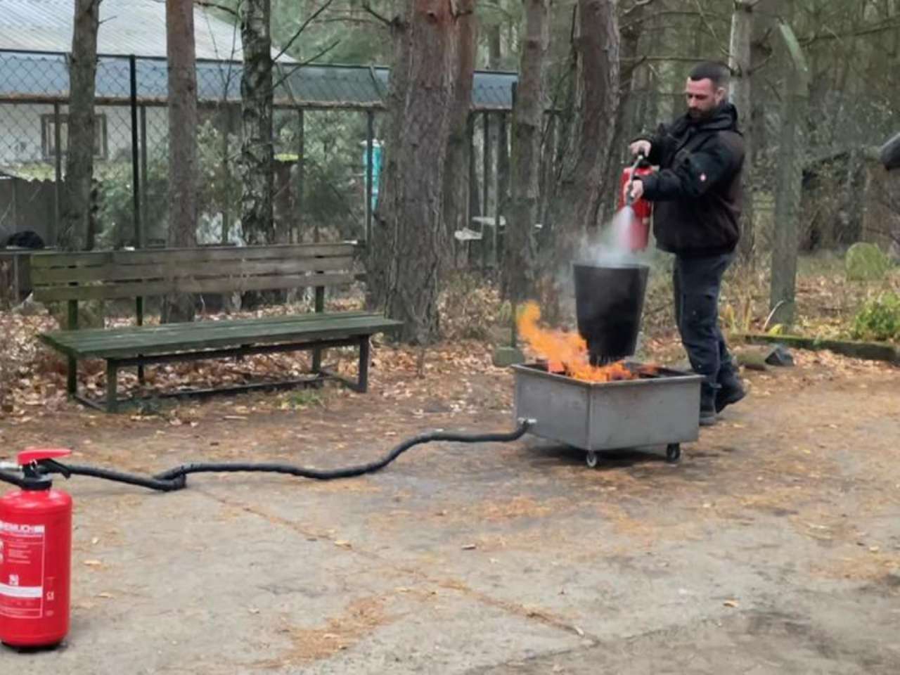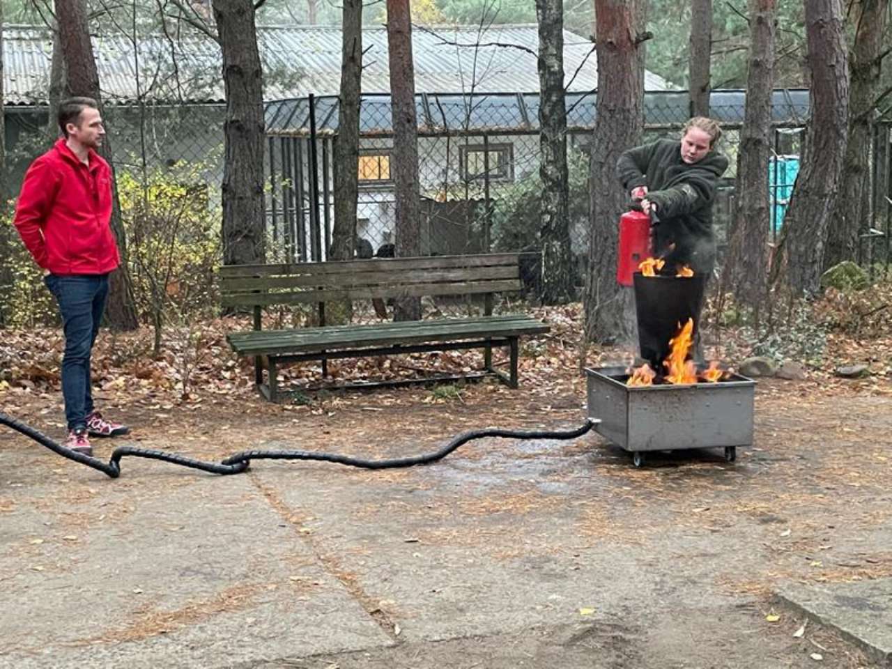 Herr Hermann von einer spezialisierten Schulungsfirma aus Brandenburg/Havel kam zu uns ins Tierheim. Zunächst gab es eine ausführliche theoretische Unterweisung zu Brandschutzmaßnahmen generell - und dann durfte jeder selbst probieren, ein kleines Feuer zu löschen.