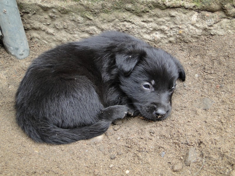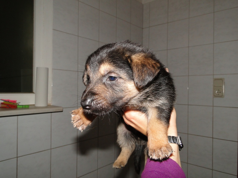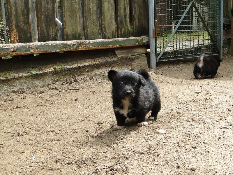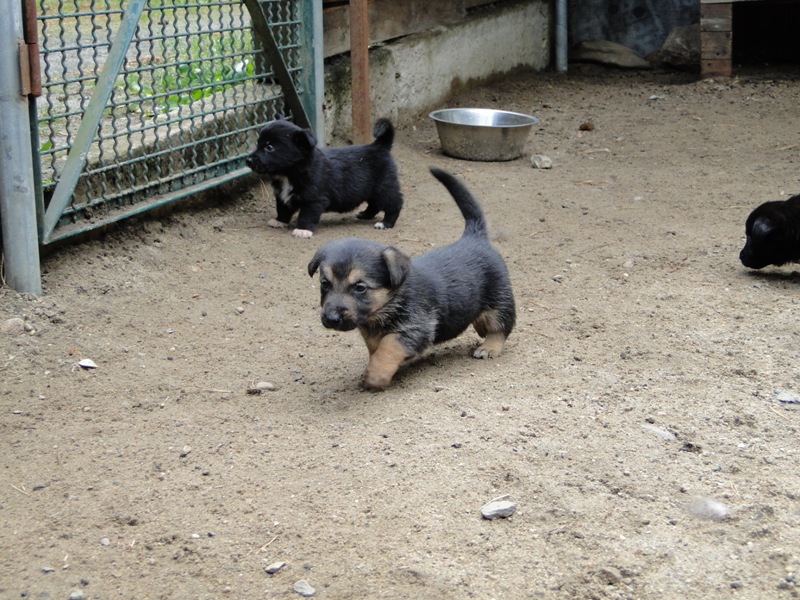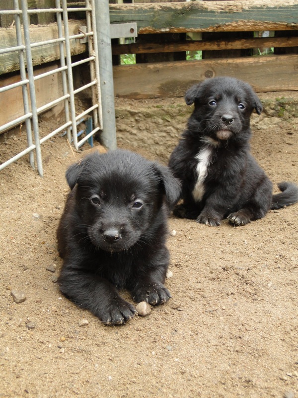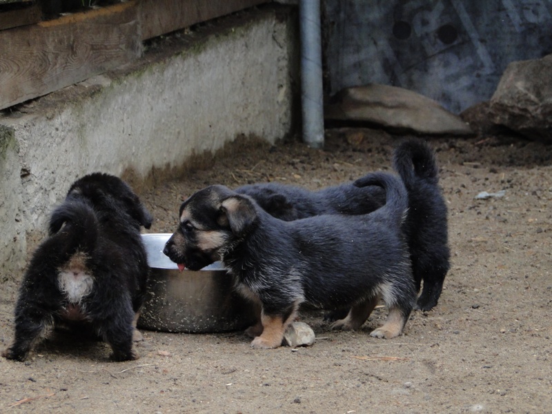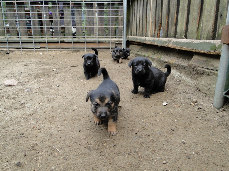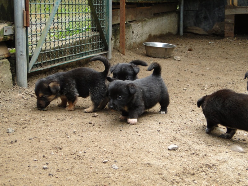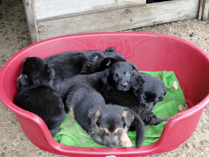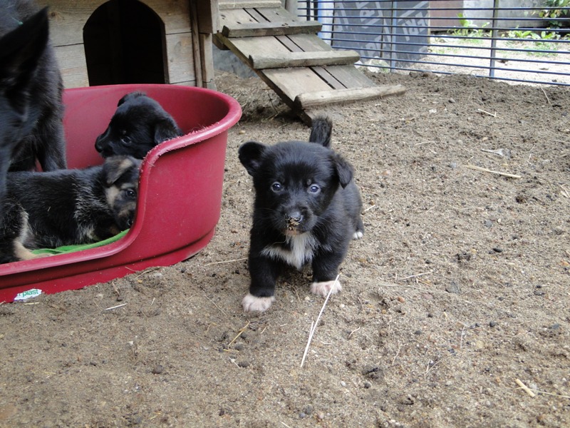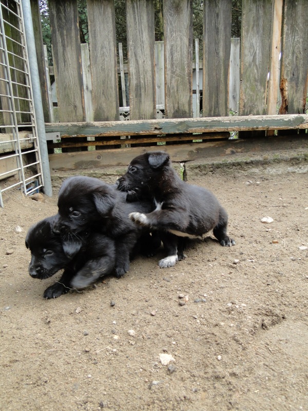 Da wir extrem voll sind, gab es keinen geeigneten Zwinger für die Kleinen. So bringen wir sie tagsüber in einem stillgelegten Kaninchenauslauf unter, damit sie auch genügend toben können.