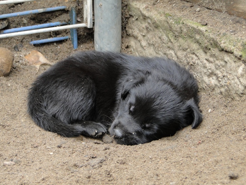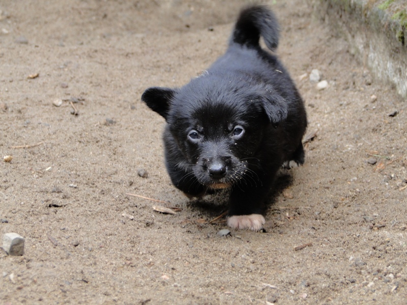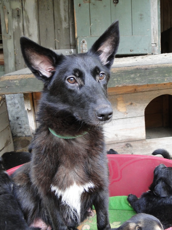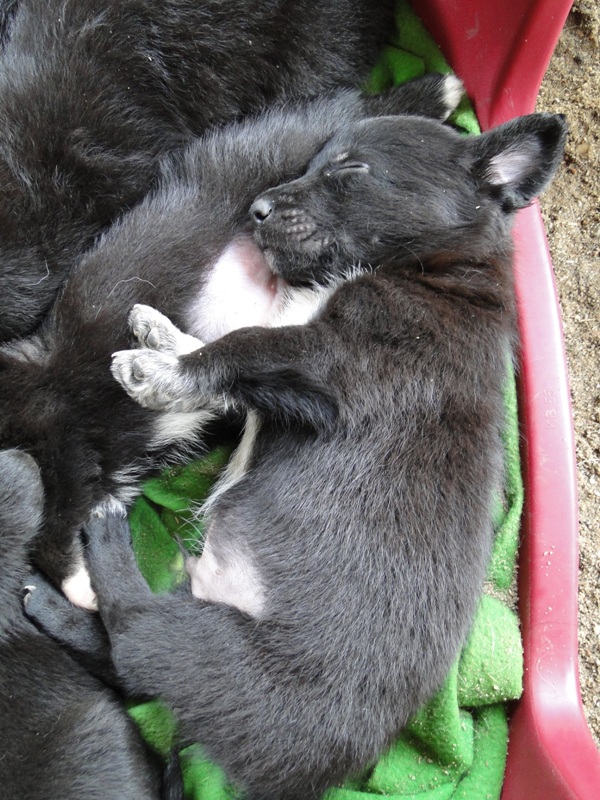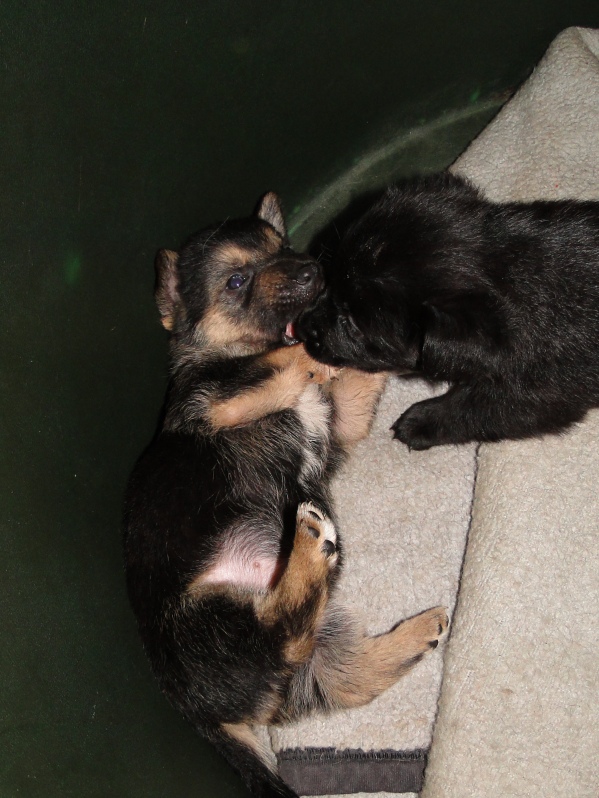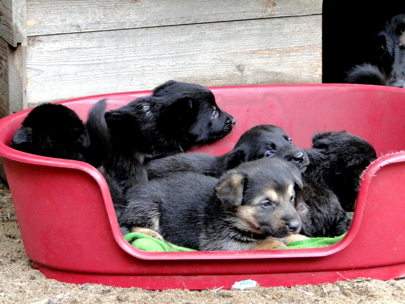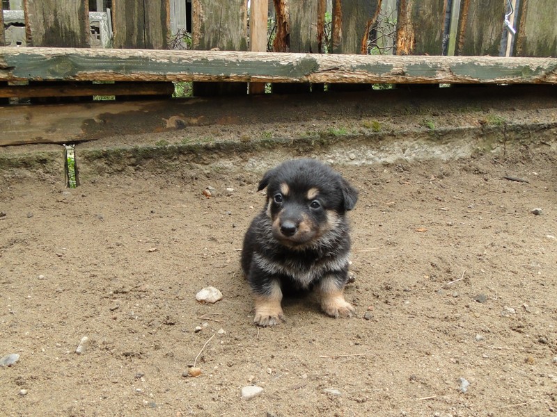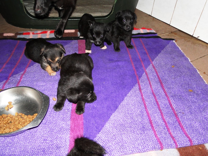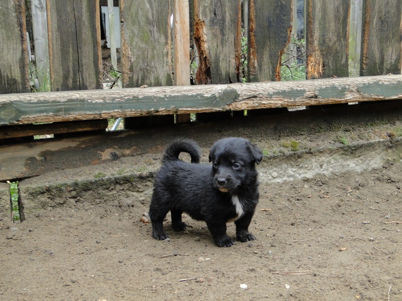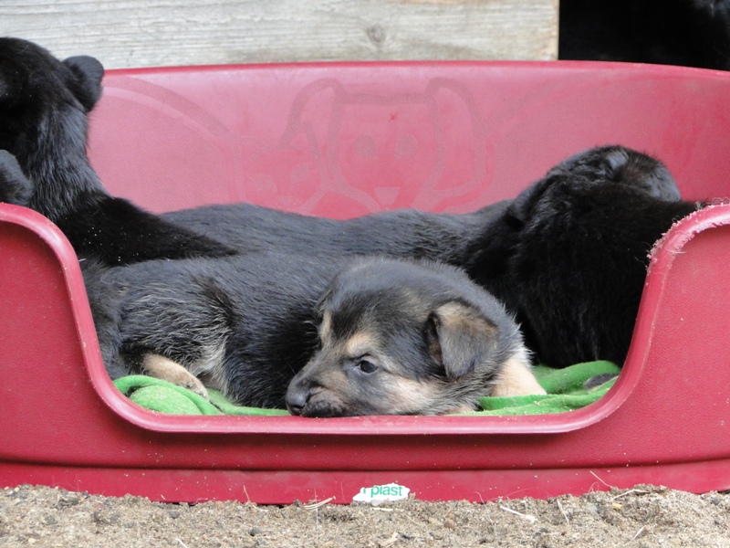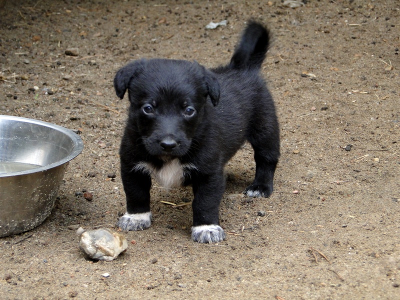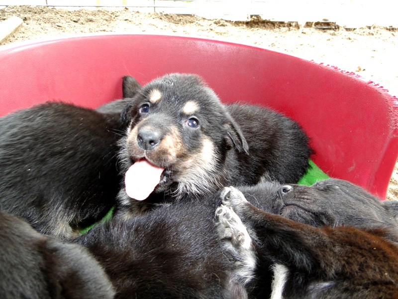 Da wir extrem voll sind, gab es keinen geeigneten Zwinger für die Kleinen. So bringen wir sie tagsüber in einem stillgelegten Kaninchenauslauf unter, damit sie auch genügend toben können.