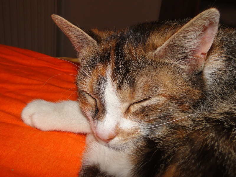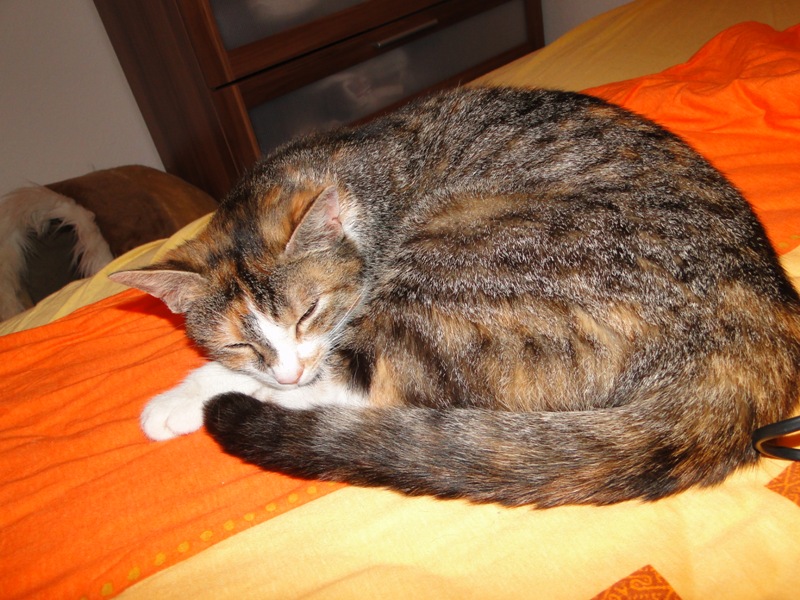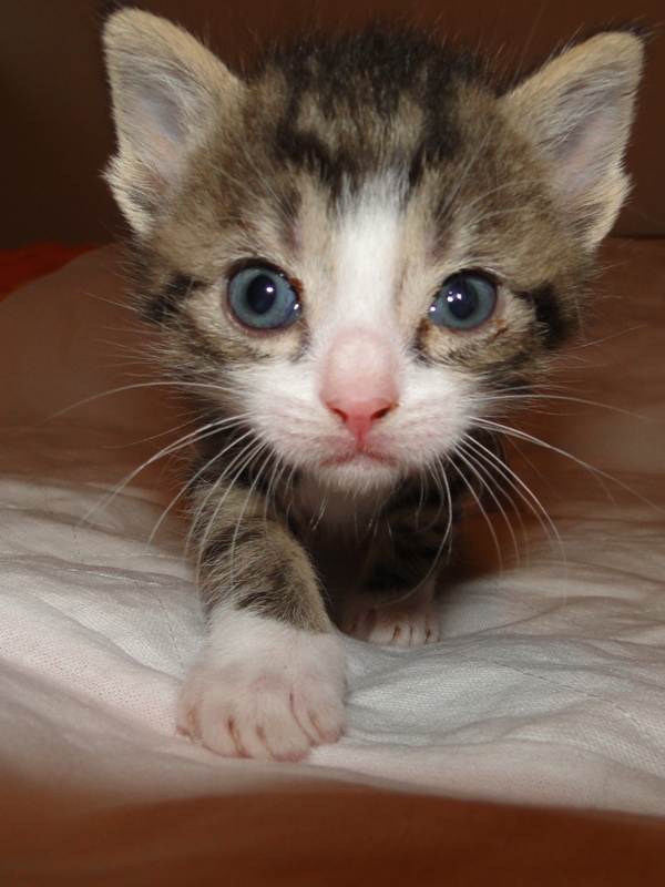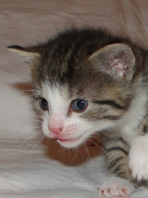 Und natürlich Fay als die Mama. Wer das Glück hat und dieser jungen Dame ein Zuhause geben darf, der hat einen Sechser im Lotto. Sie hat mittlererweile verstanden, wofür der Kratzbaum gedacht ist. Sie ist absolut stubenrein, springt nirgends drauf und hat bis jetzt keinerlei Unsinn im Kopf, was Katzen sonst so an sich haben. Was eigentlich auch schade ist, denn gewisser Unsinn bringt halt meist auch etwas Spannung mit sich. Nicht umsonst sagt man halt oft, dass Katzen ihren eigenen Kopf haben. Gut, ok, den hat sie auch, wenn es ums Kuscheln geht, denn das könnte sie stundenlang. Und wenn morgens bei mir der Wecker klingelt, dann stelle ich ihn meist so ein, dass er noch ein paar Mal klingelt. Das Klingeln ist allerdings der Startschuss für Fay, jetzt schmusen zu wollen. Aber immerhin wartet sie, bis der Wecker klingelt und tobt nicht Nachts durch die Gegend wie meine eigenen Katzen. Sehr sympathisch, muss ich ja zugeben. So, und nun lasse ich mal Bilder sprechen. Ach ja, da fällt mir ein: heute habe ich zum ersten Mal probiert, ob die Kleinen auch schon selbst aus dem Schüsselchen trinken, denn ihre Zähne sind draußen und traktieren die Mama ganz schön. Die ersten Versuche sind allerdings gescheitert. Ein Katerchen fand es zwar lecker, hat aber eher versucht, den Rand der Schüssel zu essen anstatt die Milch. Naja, ist ja noch kein Meister vom Himmel gefallen und mit ein bißchen Übung klappt das auch. Sie haben ja noch Zeit.