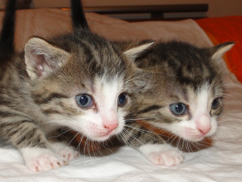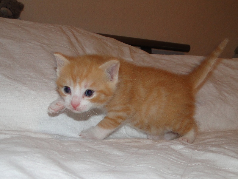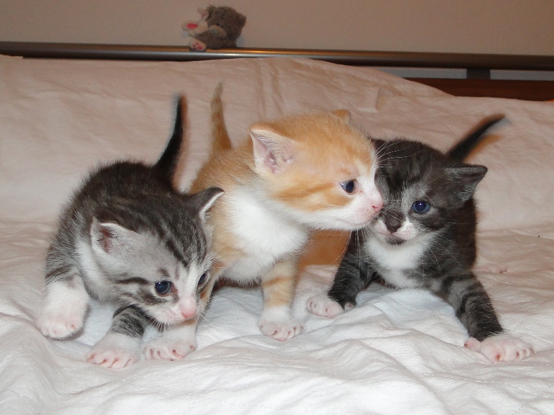 Die ersten 3 Kitten sind jeweils die Jungs. Der rote ist ein kleiner Raufbold, muss immer der Erste sein und ist teilweise schon schneller an der Tür als die Mama. Der hübsche Tiger mit dem weißen Gesicht ist ein ganz lieber und aufgeweckter junger Fratz. Der dunkle Tiger ist einen absoluter Schmuser und läuft mir ständig hinterher. Und nun noch die zwei Mädels. Im Gegensatz zu ihren Brüdern sind sie zierlich und etwas zurückhaltend - aber nichtsdestotrotz absolut zutraulich. Aber sie wissen halt, wie man sich benimmt.