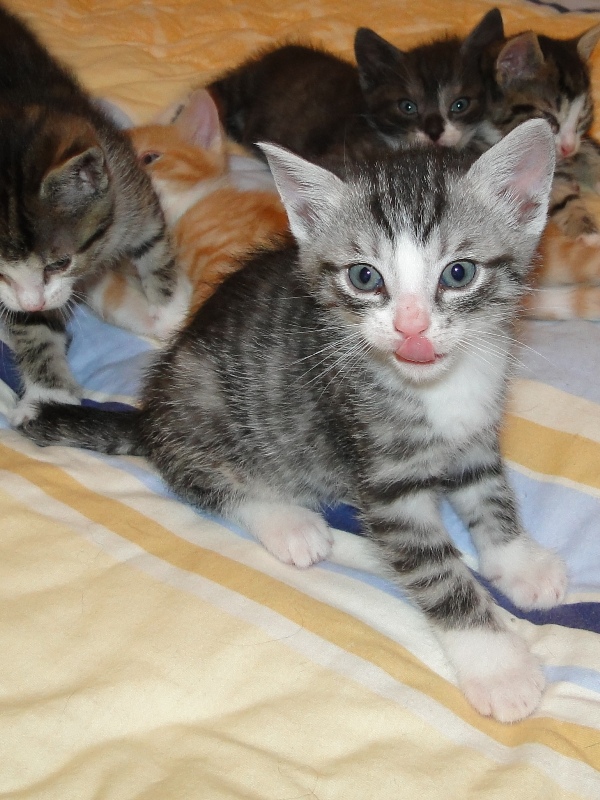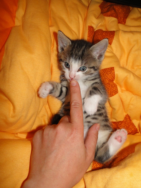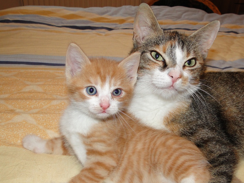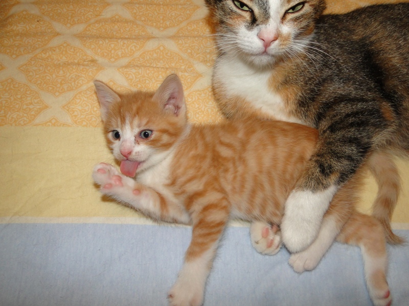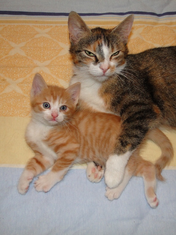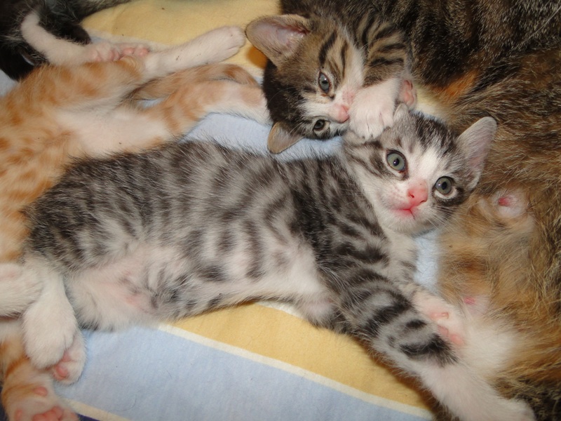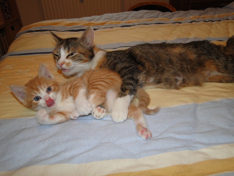 Mama Fay mit Baby "Mittlererweile haben die Kleinen schon gelernt, dass es durchaus weh tun kann, wenn man dem anderen die Krallen oder die kleinen spitzen Zähnchen irgendwo reinhaut. Genau deshalb ist es so wichtig, dass die Kitten nicht so früh voneinander getrennt werden: um eben genau diese Erfahrungen unter Artgenossen sammeln können. Wie mir berichtet wurde, gibt es schon reges Interesse an den Kleinen. Von daher möchte ich Sie bitten: Lassen Sie den Kleinen noch die Zeit, bis sie mindestens 12-13 Wochen alt sind. Sollten Sie das Glück haben, die Anstellung als Dosenöffner und Animateur von einigen dieser kleinen Kitten zu erhalten, dann werden Sie noch viele weitere wundervolle Jahre mit ihnen verbringen. Sie können auch dann noch zusehen und miterleben, wie sie aufwachsen und die einen oder anderen Abenteuer erleben. Blödsinn werden die noch genug anstellen, das verspreche ich Ihnen. Nur lassen Sie den Kleinen die Möglichkeit, ihre ersten Erfahrungen zu sammeln, um dann später gut sozialisiert bei Ihnen einziehen zu dürfen.
