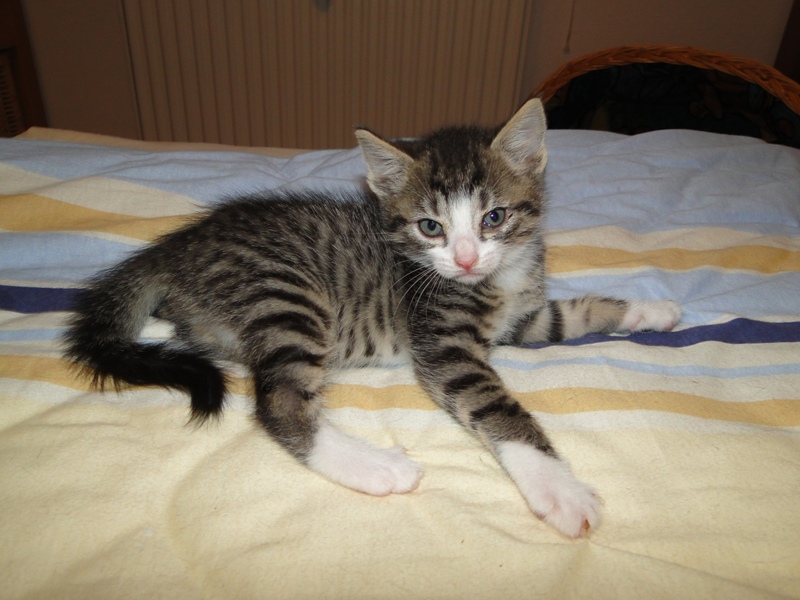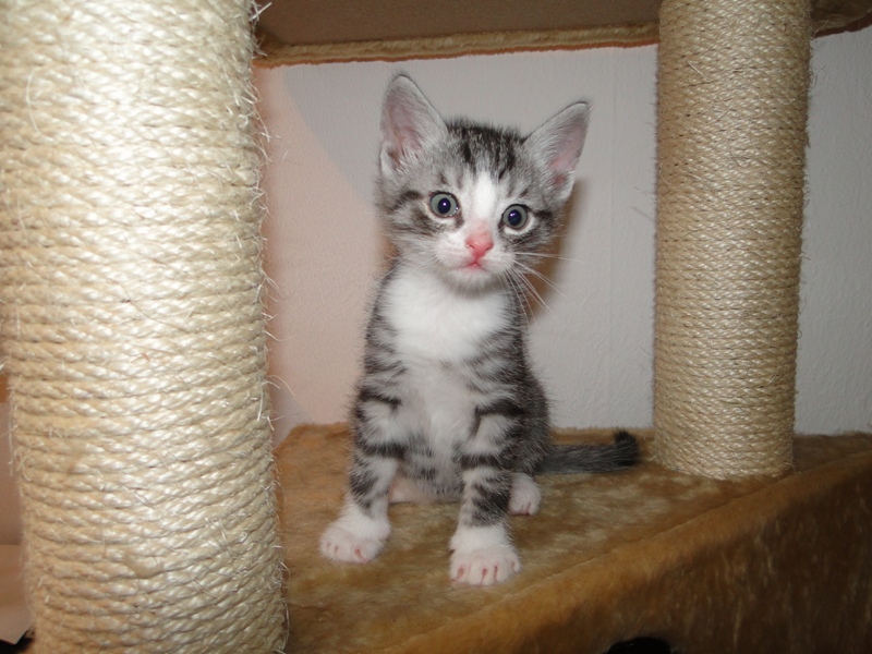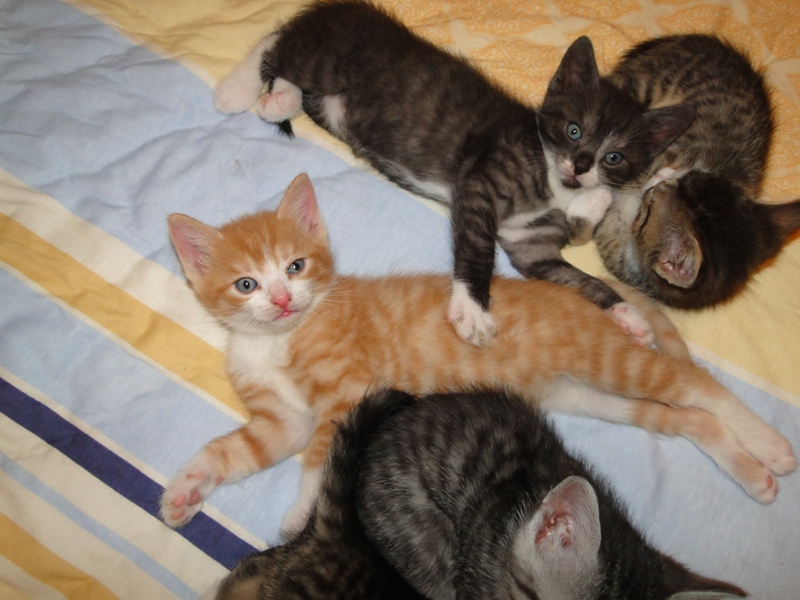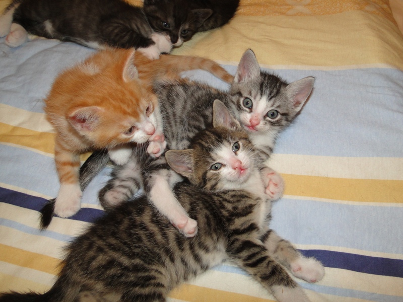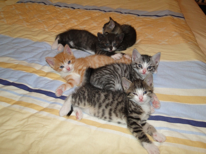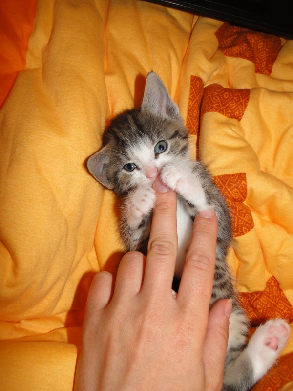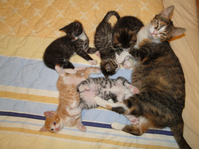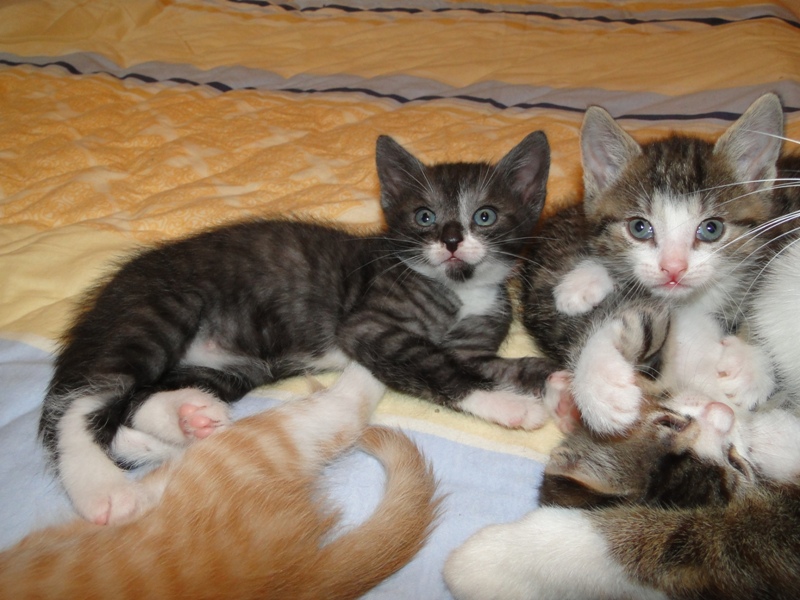 Mama Fay mit Baby "Mittlererweile haben die Kleinen schon gelernt, dass es durchaus weh tun kann, wenn man dem anderen die Krallen oder die kleinen spitzen Zähnchen irgendwo reinhaut. Genau deshalb ist es so wichtig, dass die Kitten nicht so früh voneinander getrennt werden: um eben genau diese Erfahrungen unter Artgenossen sammeln können. Wie mir berichtet wurde, gibt es schon reges Interesse an den Kleinen. Von daher möchte ich Sie bitten: Lassen Sie den Kleinen noch die Zeit, bis sie mindestens 12-13 Wochen alt sind. Sollten Sie das Glück haben, die Anstellung als Dosenöffner und Animateur von einigen dieser kleinen Kitten zu erhalten, dann werden Sie noch viele weitere wundervolle Jahre mit ihnen verbringen. Sie können auch dann noch zusehen und miterleben, wie sie aufwachsen und die einen oder anderen Abenteuer erleben. Blödsinn werden die noch genug anstellen, das verspreche ich Ihnen. Nur lassen Sie den Kleinen die Möglichkeit, ihre ersten Erfahrungen zu sammeln, um dann später gut sozialisiert bei Ihnen einziehen zu dürfen.