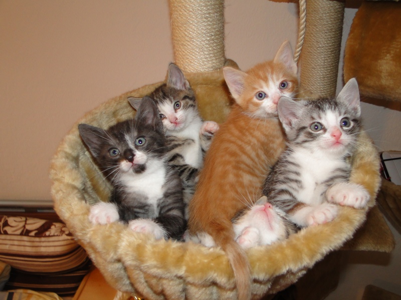 Soviel Neues zu berichten gibt es eigentlich nicht. Sie sind absolut munter und haben es gestern auch endlich geschafft, den zimmerhohen Kratzbaum vollkommen in Beschlag zu nehmen. Sie üben Weitsprung, was natürlich nicht immer klappt, aber Übung macht den Meister. Was ihre Charaktere angeht - ja, das ist schwierig. Anfangs war ja der rote Kater ein Haudegen vom Feinsten. Die Fotos bei Mama im Arm können täuschen, meistens hat sie ihn gemaßregelt, ehe es zu den Fotos kam. Scheinbar hat ihn das ein bißchen gebremst, denn seine Brüder haben ihm den Rang als Raufbold abgelaufen. Der kleine Schwarze, der so lieb immer bei mir saß, weiß gar nicht so recht, wen er sich manchmal als erstes schnappen soll. Aber auch die Mädchen lassen sich nicht lumpen und steigen gerne mit ein, wenn es heißt "Alle auf einen".
