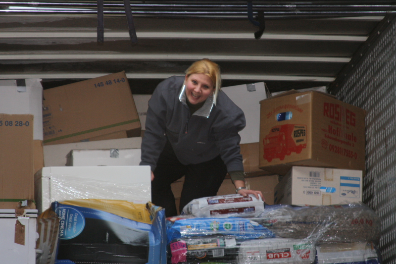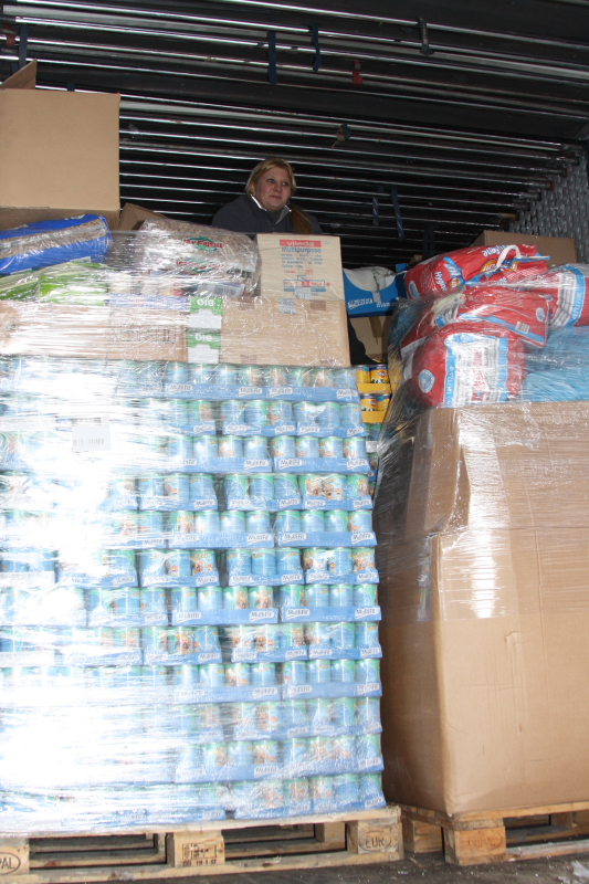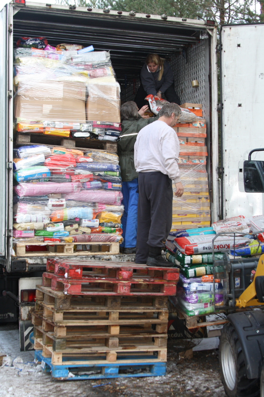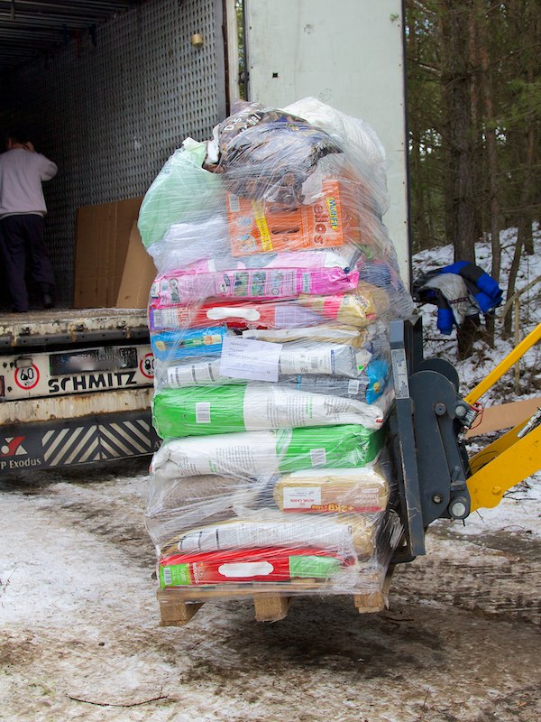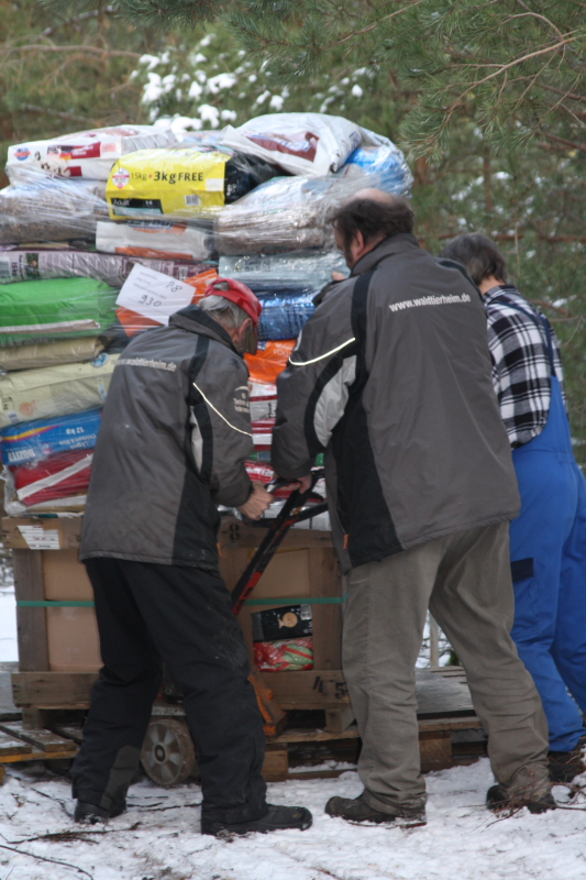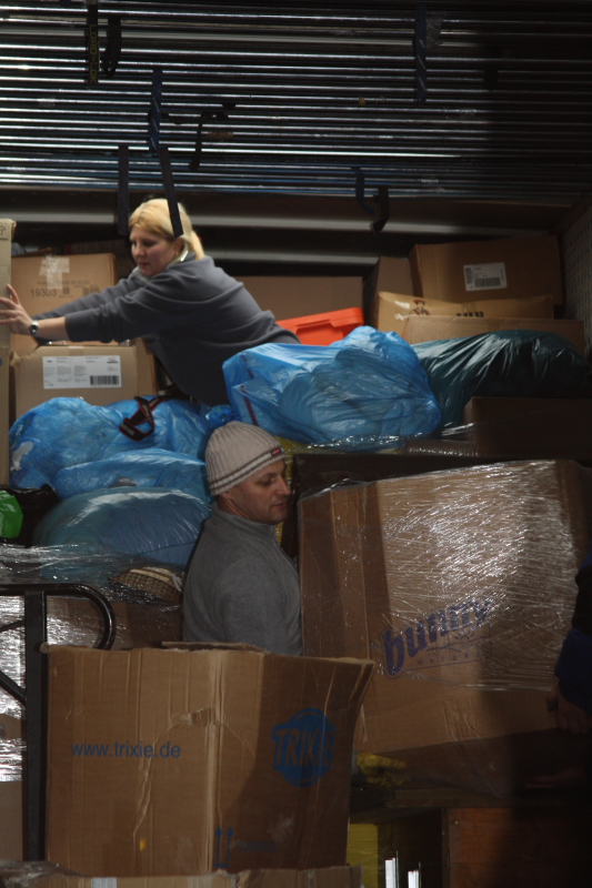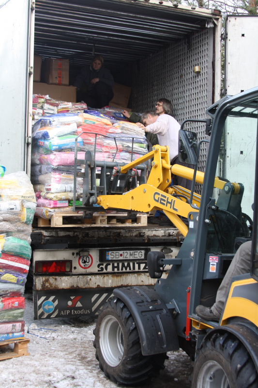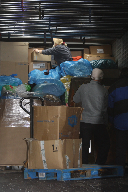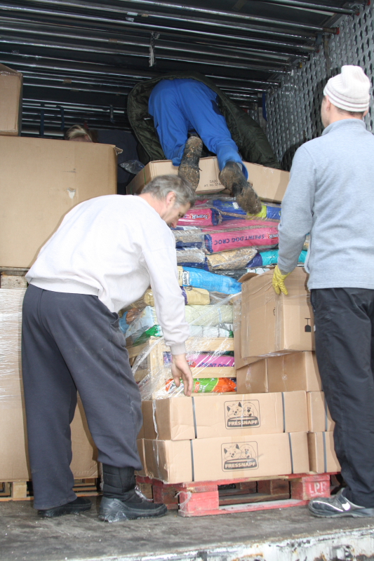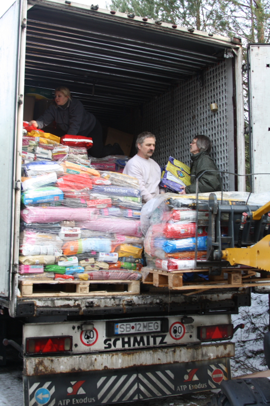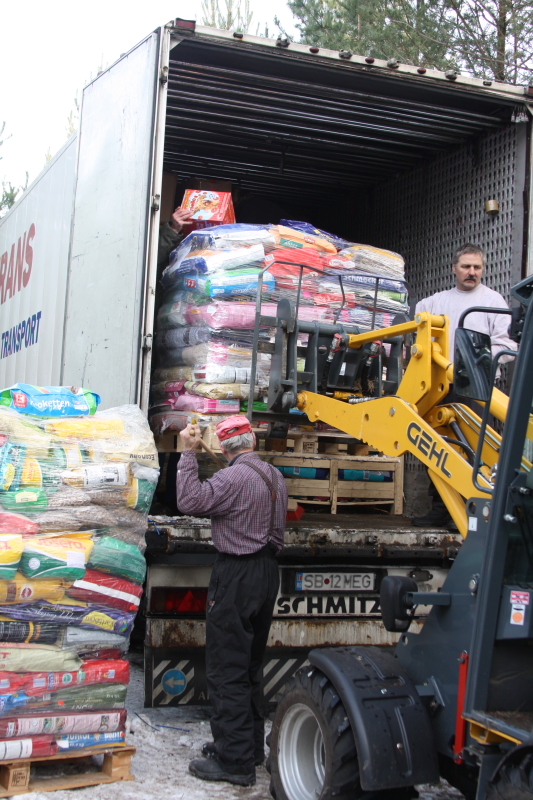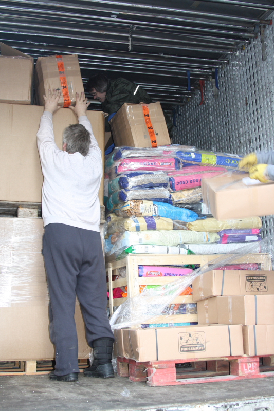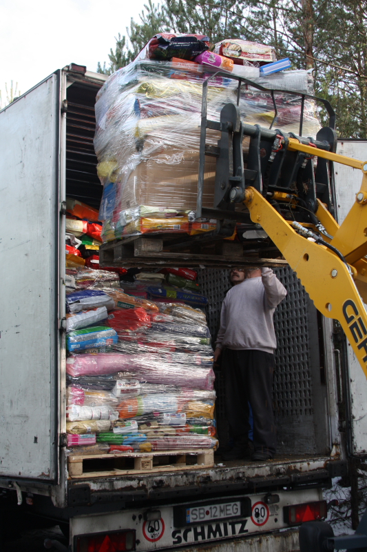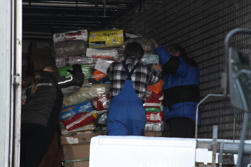 Am 01.02. war es nun soweit: 20 Tonnen Futter und 3 Tonnen Sachspenden (Decken, Werkzeuge, Kühlschränke, Handschuhe, Rollstühle und vieles mehr) wurden von Ehrenamtlern und Mitarbeitern unseres Tierheimes verladen.