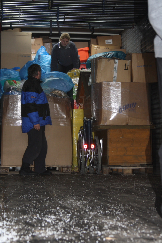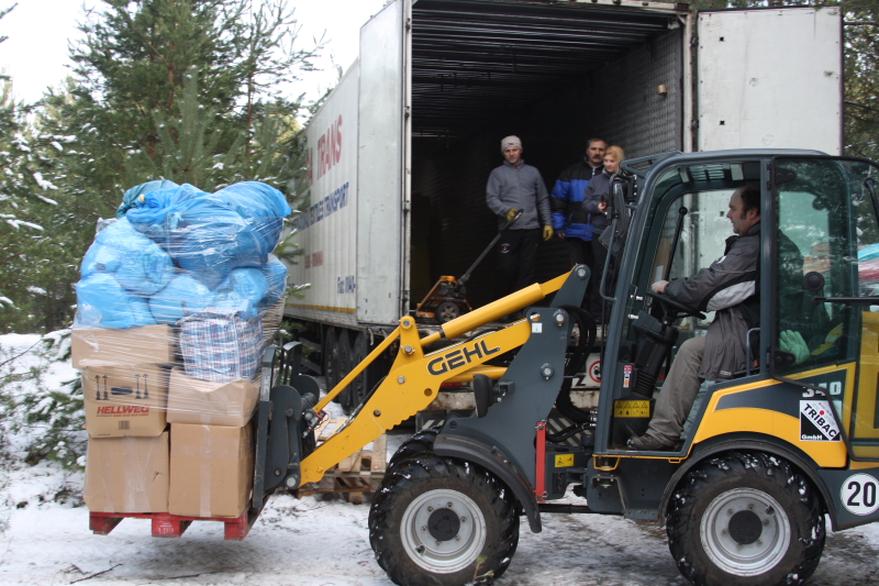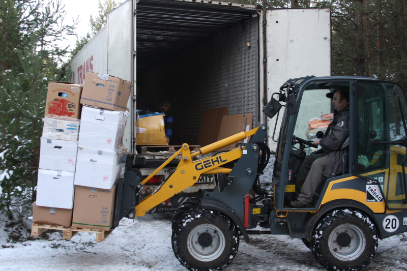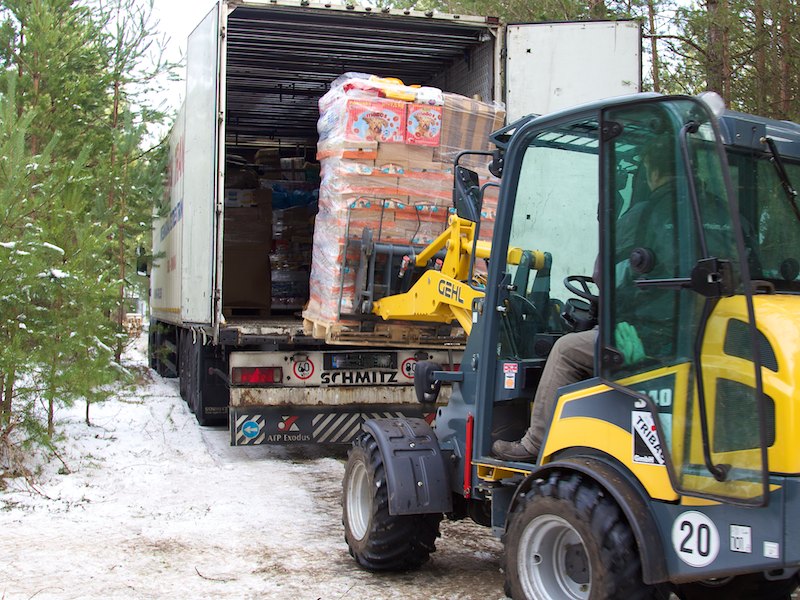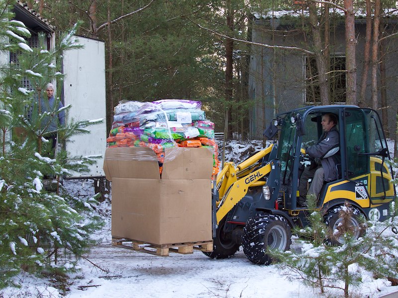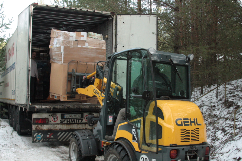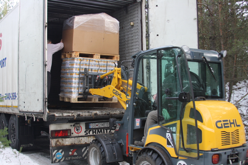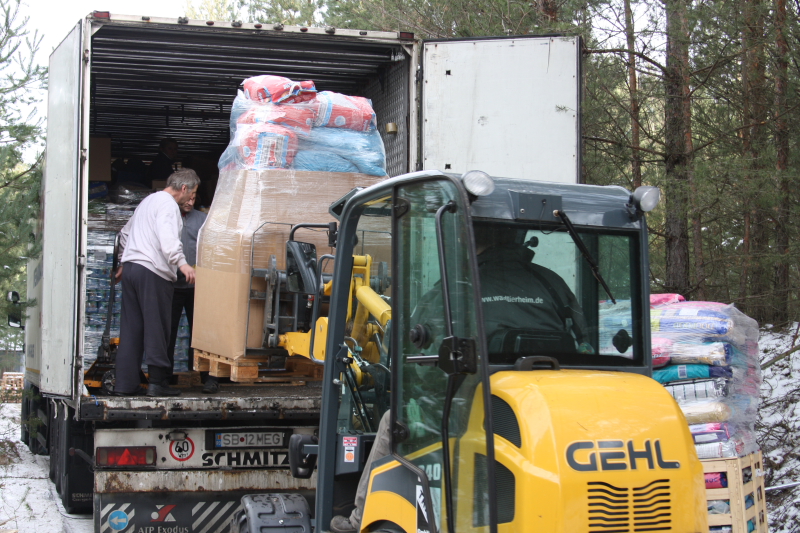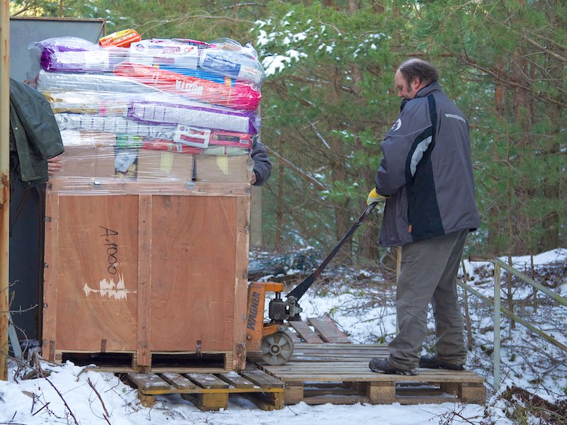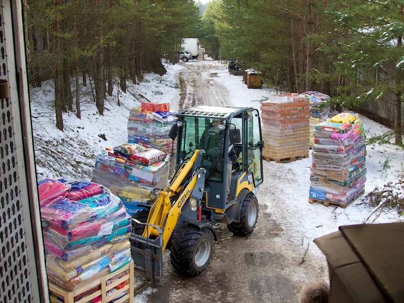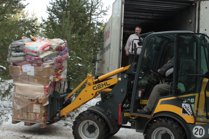 Schon seit Wochen waren unsere Mitarbeiter damit beschäftigt, die Paletten zu packen, einzustretchen und zu wiegen. Weitere Helfer fassten dann beim Beladen zu. Unseren Gabelhubwagen hat es bei der Aktion gleich zu Beginn zerlegt. Zum Glück ist unser Tierheimleiter auch Handwerksmeister und konnte ihn gleich schweißen. Sonst wäre es wohl nichts mehr geworden mit der Abfahrt des LKW. Dann bereitete auch noch die Glätte Probleme: Mit einem Gesamtgewicht von über 40 Tonnen kam der LKW unser leicht hügeliges Gelände nicht mehr hoch. Sofort eilte das THW zu Hilfe!