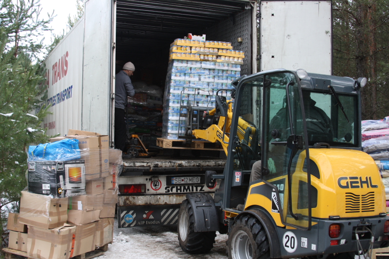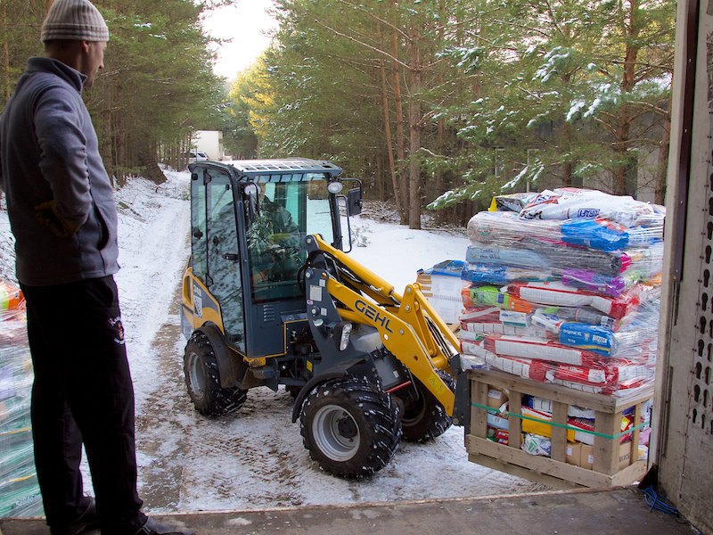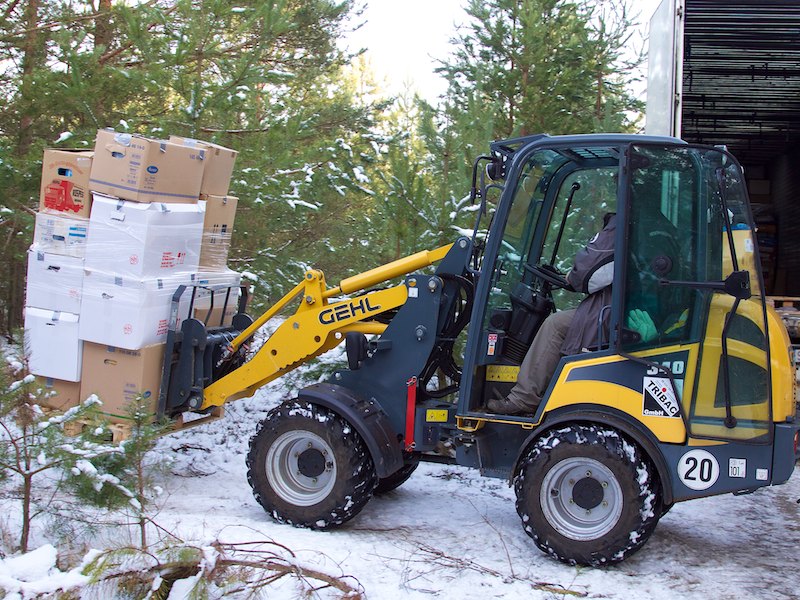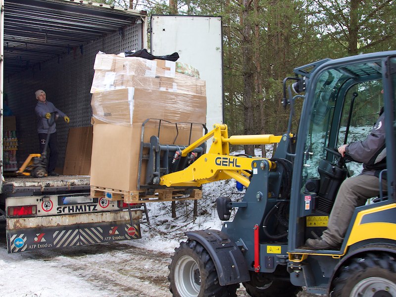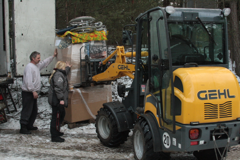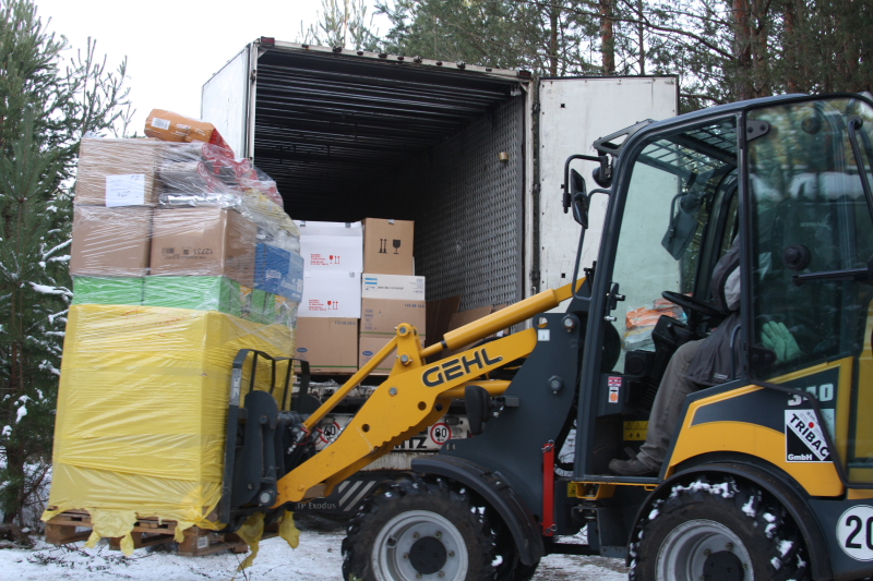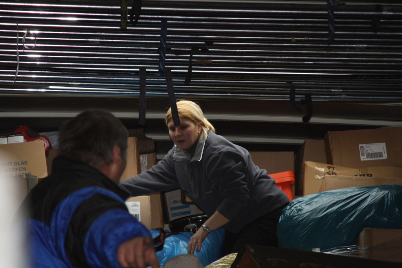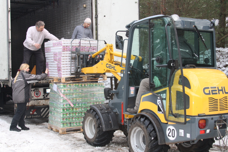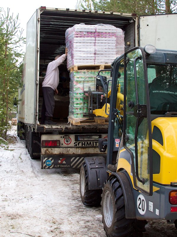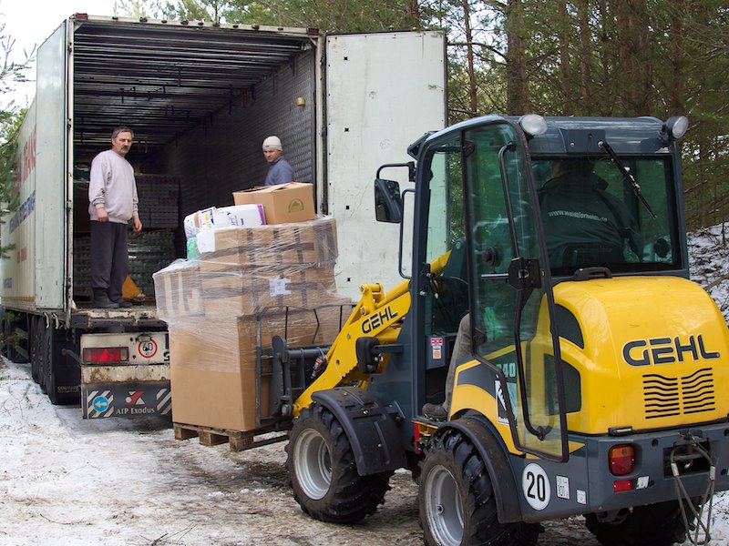 Schon seit Wochen waren unsere Mitarbeiter damit beschäftigt, die Paletten zu packen, einzustretchen und zu wiegen. Weitere Helfer fassten dann beim Beladen zu. Unseren Gabelhubwagen hat es bei der Aktion gleich zu Beginn zerlegt. Zum Glück ist unser Tierheimleiter auch Handwerksmeister und konnte ihn gleich schweißen. Sonst wäre es wohl nichts mehr geworden mit der Abfahrt des LKW. Dann bereitete auch noch die Glätte Probleme: Mit einem Gesamtgewicht von über 40 Tonnen kam der LKW unser leicht hügeliges Gelände nicht mehr hoch. Sofort eilte das THW zu Hilfe!