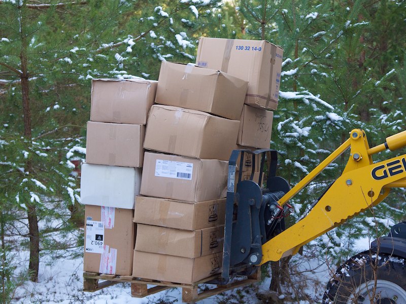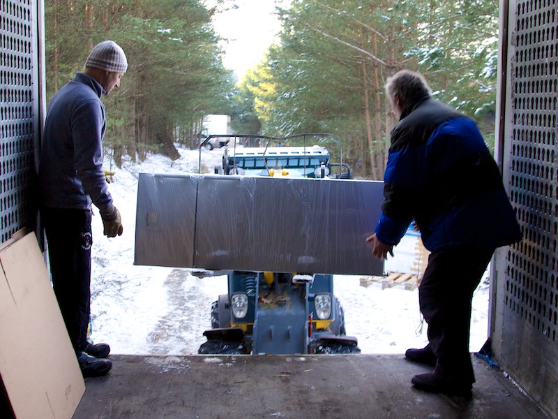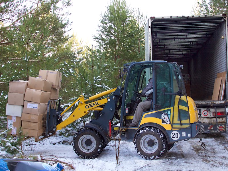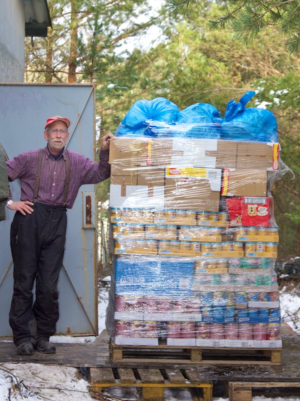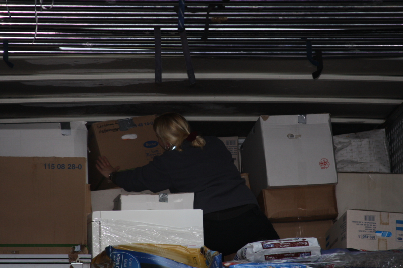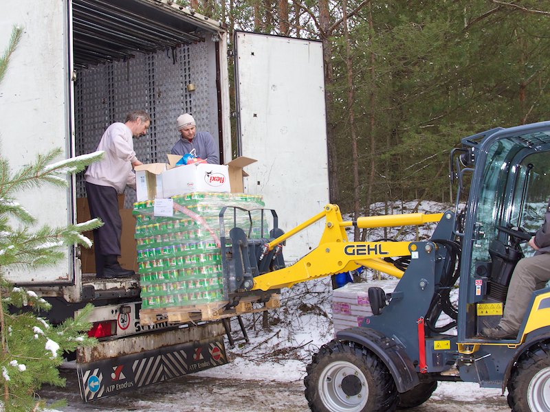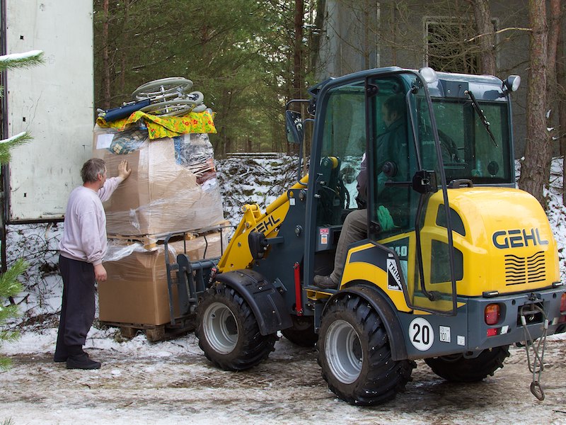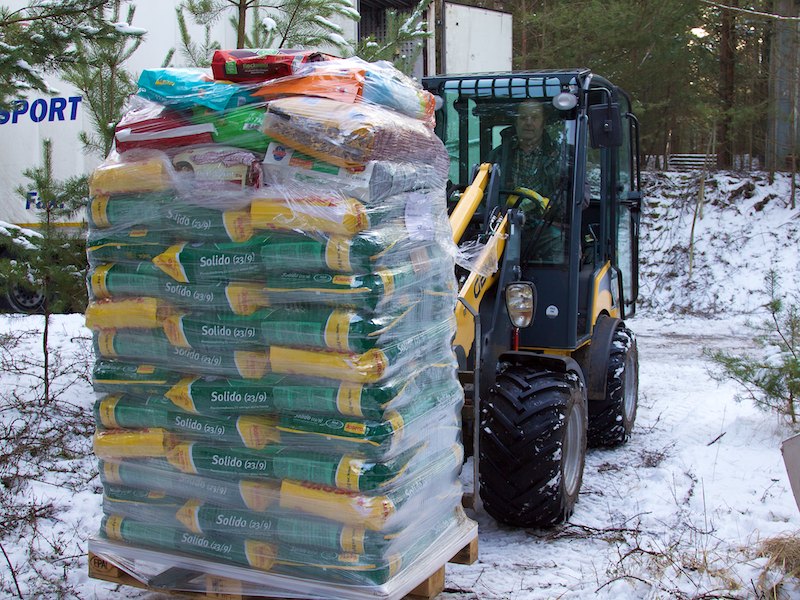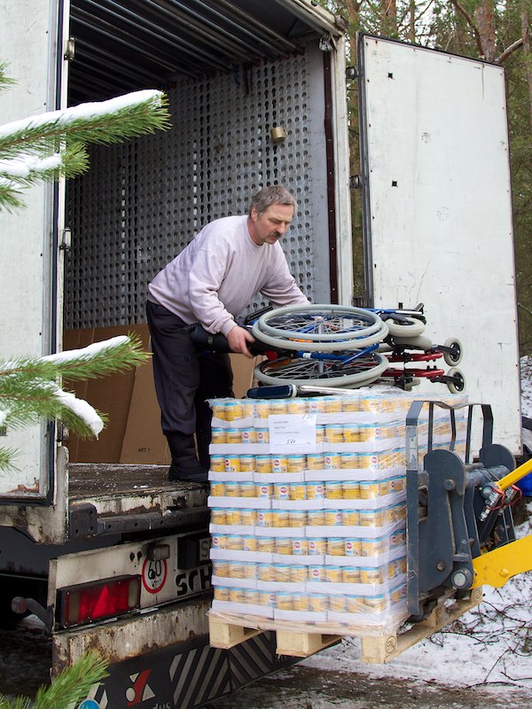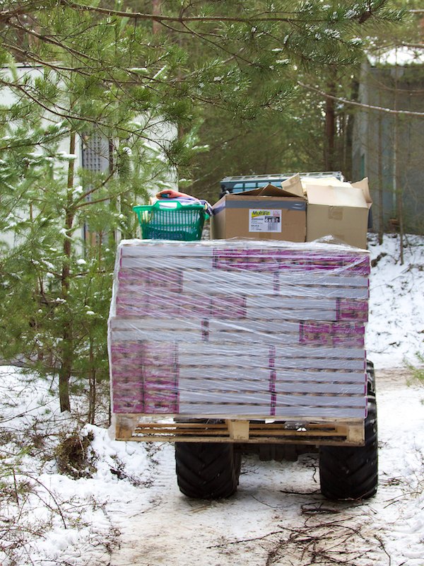 Schon seit Wochen waren unsere Mitarbeiter damit beschäftigt, die Paletten zu packen, einzustretchen und zu wiegen. Weitere Helfer fassten dann beim Beladen zu. Unseren Gabelhubwagen hat es bei der Aktion gleich zu Beginn zerlegt. Zum Glück ist unser Tierheimleiter auch Handwerksmeister und konnte ihn gleich schweißen. Sonst wäre es wohl nichts mehr geworden mit der Abfahrt des LKW. Dann bereitete auch noch die Glätte Probleme: Mit einem Gesamtgewicht von über 40 Tonnen kam der LKW unser leicht hügeliges Gelände nicht mehr hoch. Sofort eilte das THW zu Hilfe!