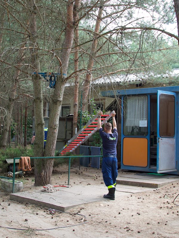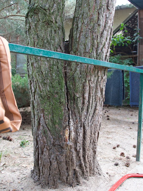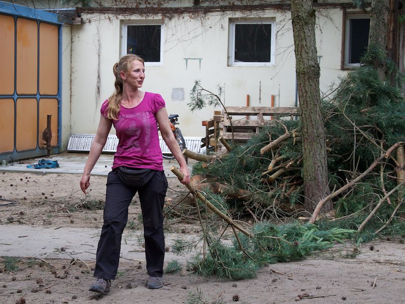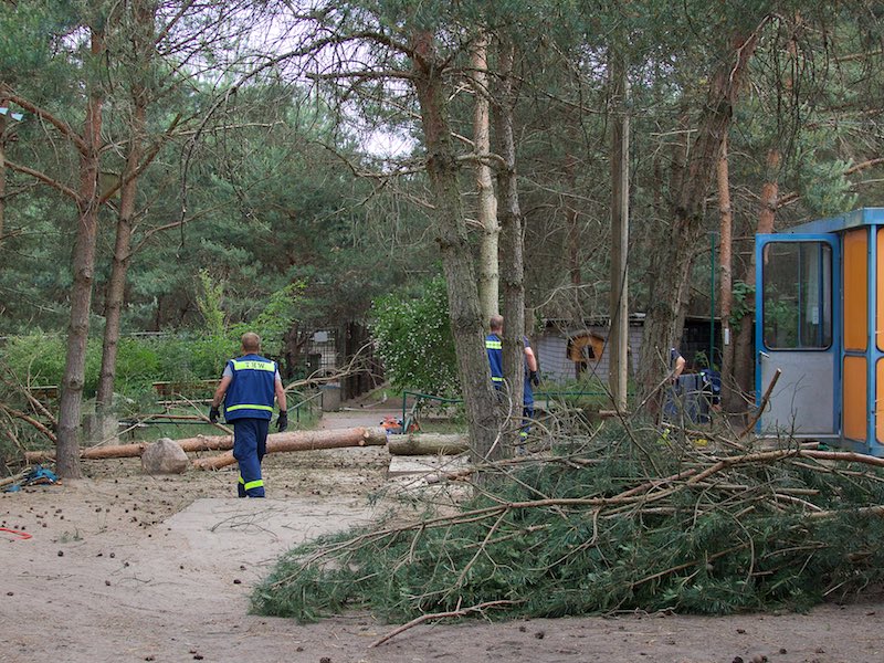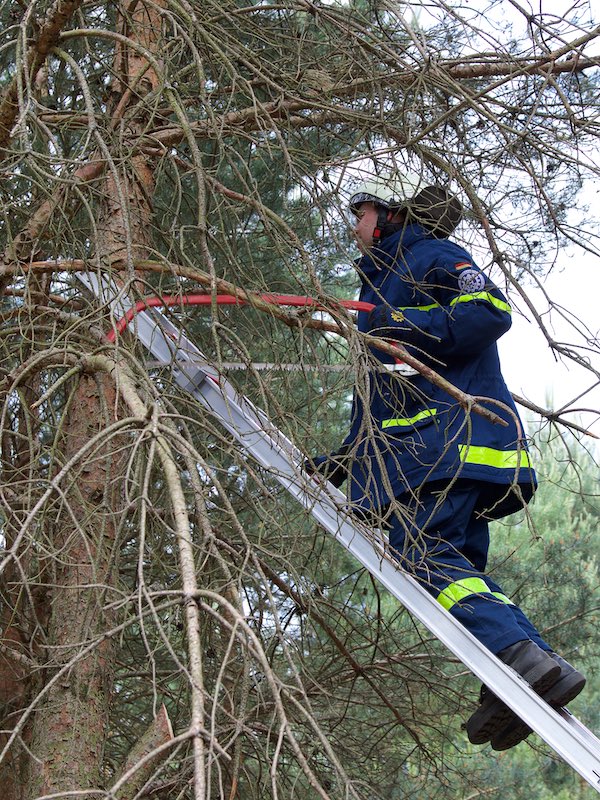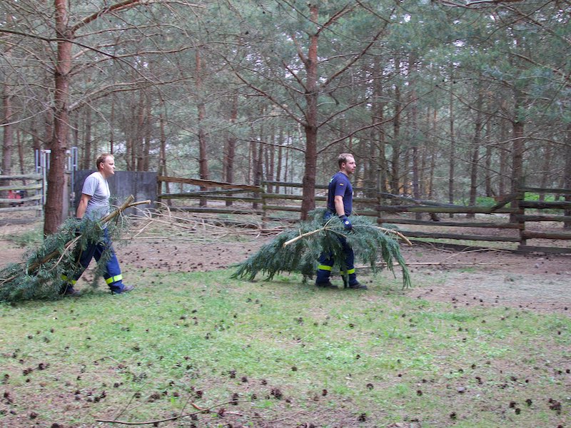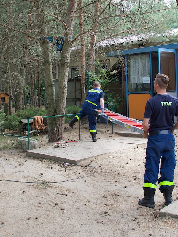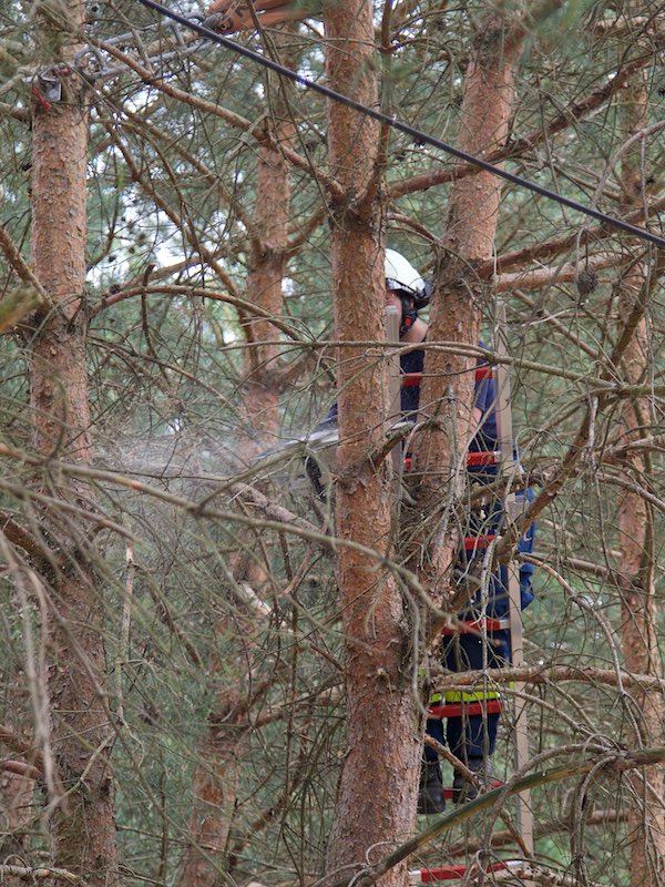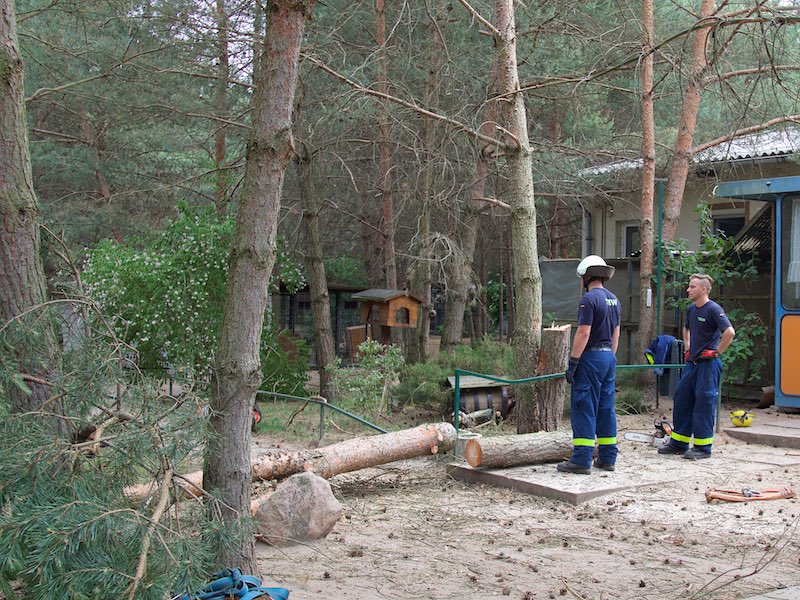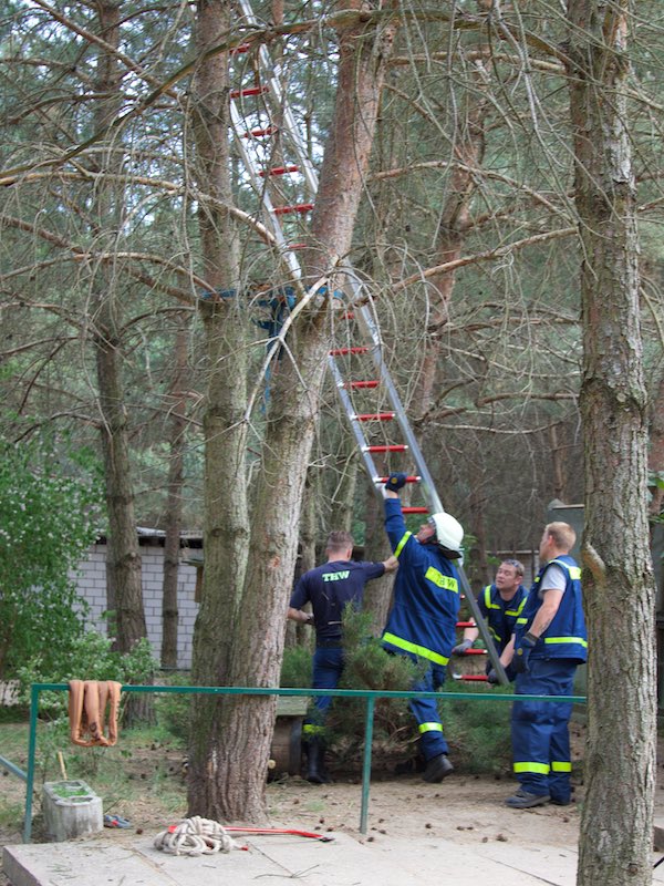 Wieder erwischte es uns unmittelbar an einem Gebäude. Ein Baum spaltete sich und drohte, auf das Haus zu fallen. Wir sicherten notdürftig, konnten aber nicht aus eigenen Kräften fällen.
