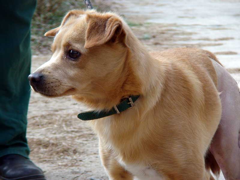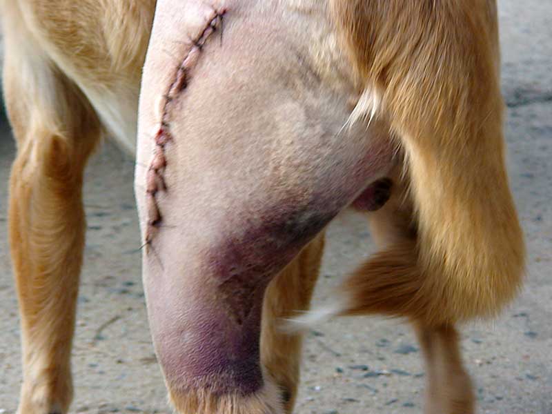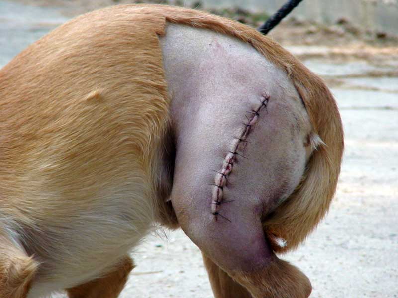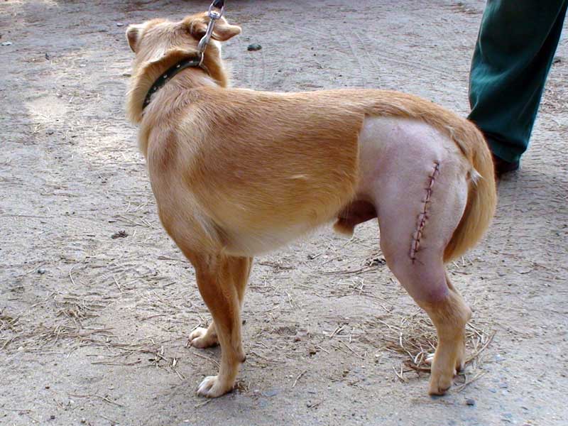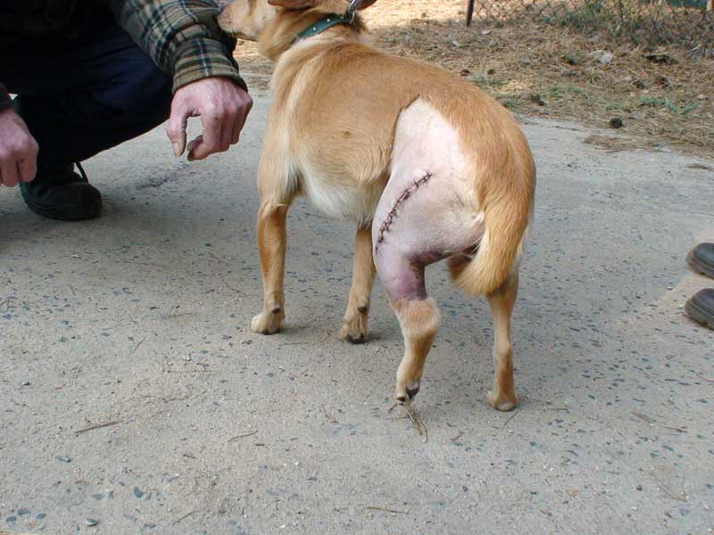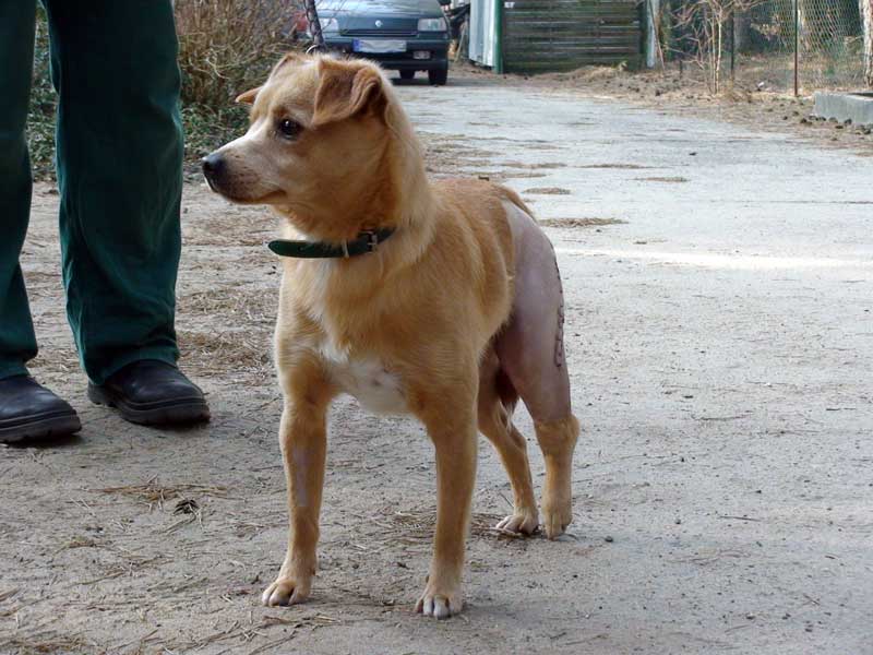 Die Tierärztin weigerte sich jedoch, einen so jungen und ansonsten fitten Hund einzuschläfern. Sie ließ sich den Hund übereignen und schaltete uns ein. Wir holten Krümel ab und brachten ihn nach Berlin zur OP. Der Oberschenkelknochen war längs gesplittert, Drähte und eine Platte wurden eingefügt, die in ein paar Monaten wieder rausoperiert werden müssen. Es war alles schlimm geschwollen, wie man unschwer erkennen kann. Doch Krümel lebt - die Schmerzen werden vergehen und das Fell wächst nach.
