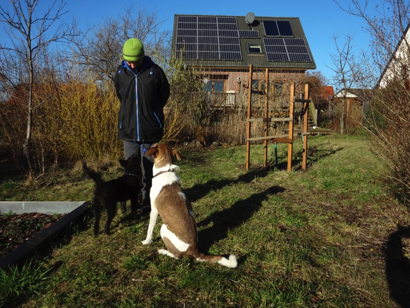 Auf der anderen Seite verhält sie sich den Katzen gegenüber aber auch super. Beispielsweise ist sie mit unserm 6-kg-Kater schon total durch den Garten gepest, ohne ihn wirklich zu jagen. Der hat sich dann auch einfach ganz cool auf eine niedrige Steinmauer gesetzt und sie vorbeirasen lassen. Es war ein Bild für Götter.