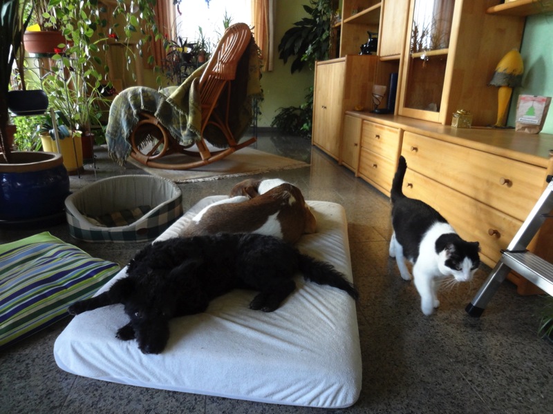 Mit Trau versteht sie sich gut, den Katzen steht sie im Großen und Ganzen freundlich gegenüber. Allerdings hat sie ab und an mal einen Aussetzer und schnappt völlig unvermittelt und ohne Warnung nach den Katzen und auch schon einmal nach Trau. Da keiner der Betroffenen wirklich gebissen wurde, gehen wir von Luftschnappern aus, hört sich aber schon recht unangenehm an und die Betroffenen sind auch irritiert, aber nicht wirklich verängstigt. Wahrscheinlich ist sie einfach noch unsicher und sucht ihren Platz in der Rangordnung. Wir versuchen, es ihr durch konsequentes Verhalten (z. B. nicht auf Couch, Sessel Bett; das Haus als letztes zu betreten, Futter bekommt sie zum Schluss usw.) leichter zu machen.