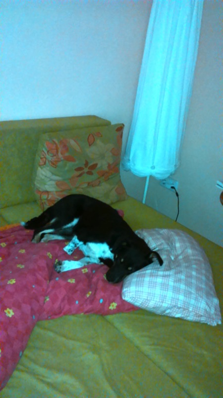 Die Bahnfahrt vom Tierheim zu uns nach Hause hat sie auf meinem Schoss gut gemeistert. Hier angekommen hat sie sich gleich auf die Terrasse gelegt und sich von der anstrengenden Fahrt ausgeruht. Sie ist bis jetzt stubenrein und wirklich sehr brav