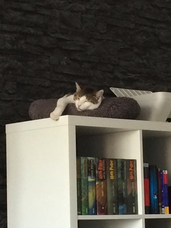 Dank den Regalen an der Wand kann ich auch jederzeit auf den Kleiderschrank, wo meine Transportbox und eine schöne Kuscheldecke liegen.