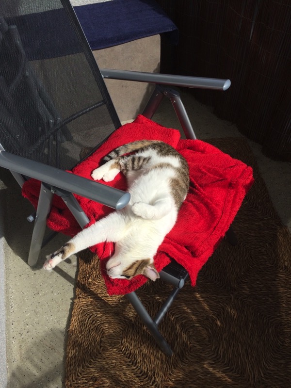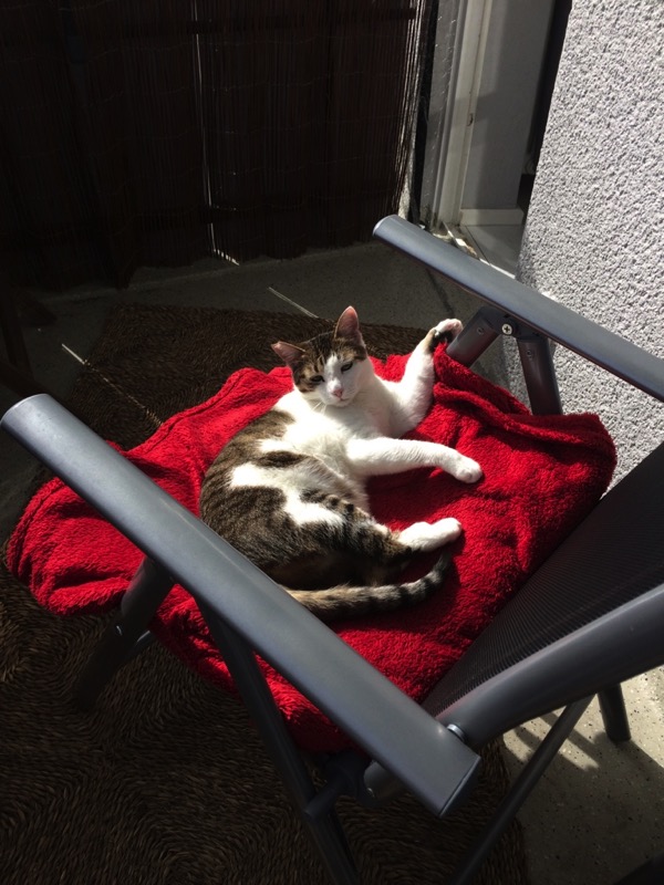 Meine Dosis haben den Balkon schön ausgebaut, sodass ich einen erhobenen Platz zum rausgucken habe und einen schönen Kuschelplatz auf dem Stuhl in der Sonne. Auch haben die beiden einen dritten Kratzbaum in Planung, der selbstgebaut und 2 Meter hoch werden soll! Juhuu!