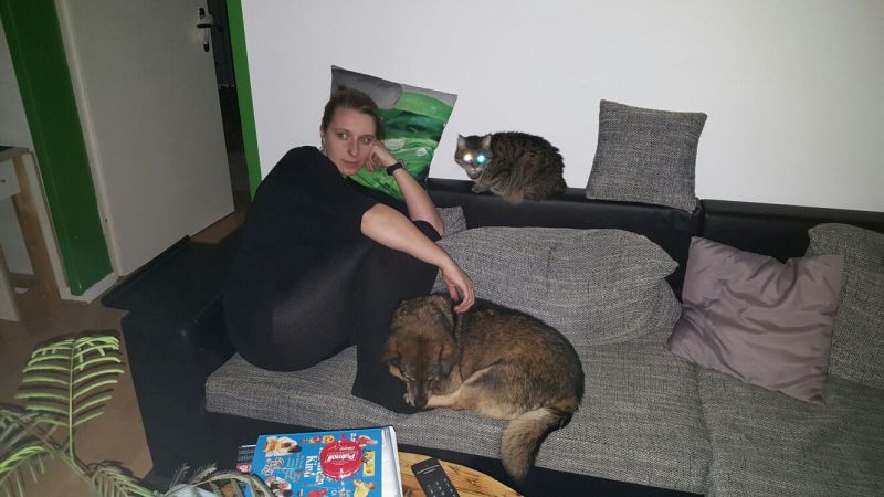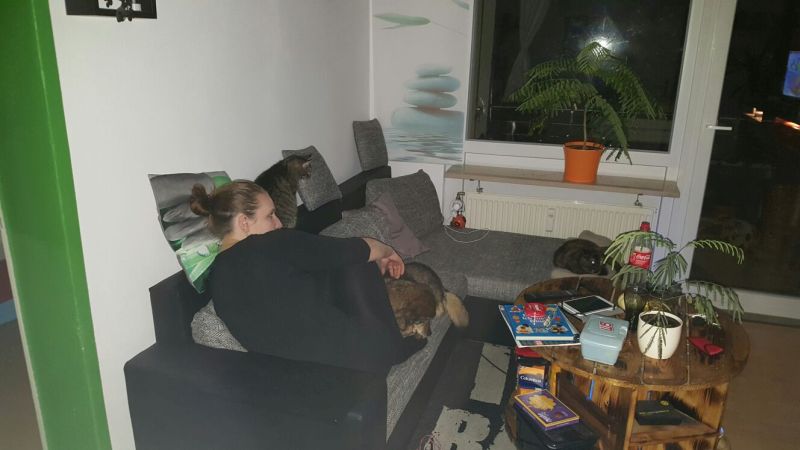 Mit meinen beiden Katzen, Lilly und Summer kommt er gut zurecht. Wir können schon alle zusammen auf der Couch kuscheln.