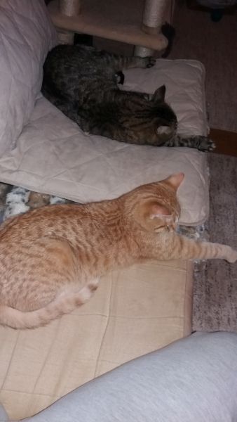 "Tabbi geht es sehr gut. Er fühlt sich wohl. Püppi ignoriert ihn und guckt ihn ab und an etwas böse an. Kasper und Tabbi beschnuppern sich. Tabbi geht immer auf Kasper zu. Kasper weis noch nicht so richtig. Also abwarten und Zeit lassen. Er frisst gut und geht auf die Katzentoiletten. Er ist so klug und flink. Ich hoffe alles wird gut." (Bild 1 und 2)