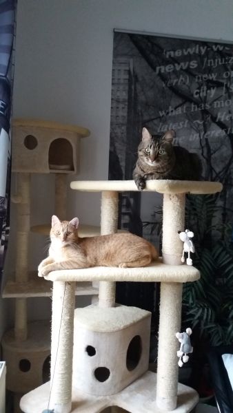 hier das neueste von Tabbi und Kasper. Beide sind Freunde. Sie spielen und toben zusammen. Sie schlafen sogar beide im Bett neben mir. Alles super und Püppi hat ihre Ruhe. Sie guckt aber zu wenn beide spielen.